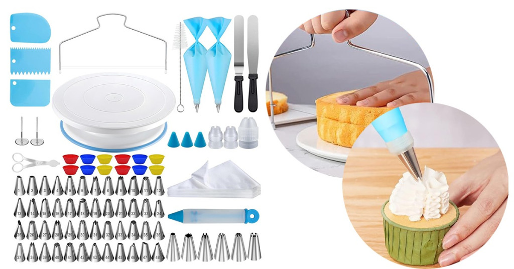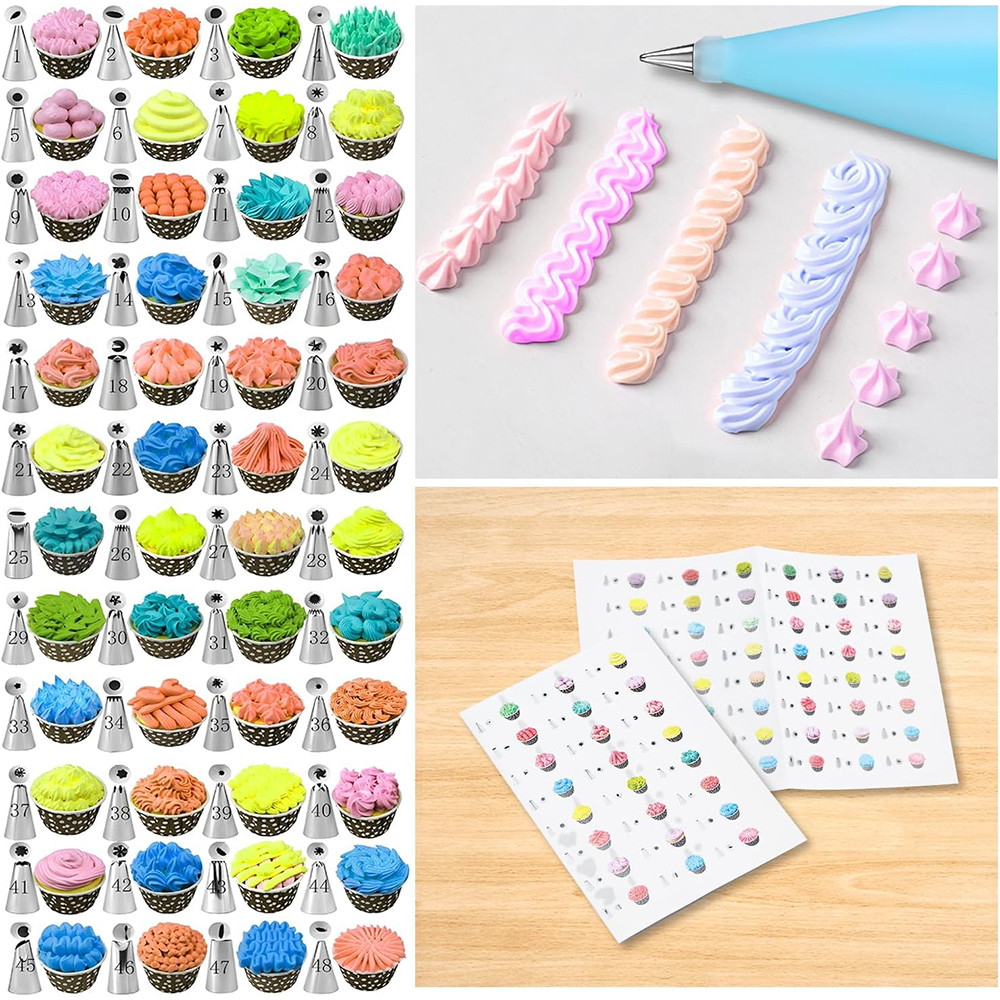 Balení obsahuje vše potřebné pro přesné a efektní zdobení: trysky, formy, stěrky, silikonové formičky na muffiny, otočný podnos a mnoho dalších doplňků pro svobodnou kreativitu.