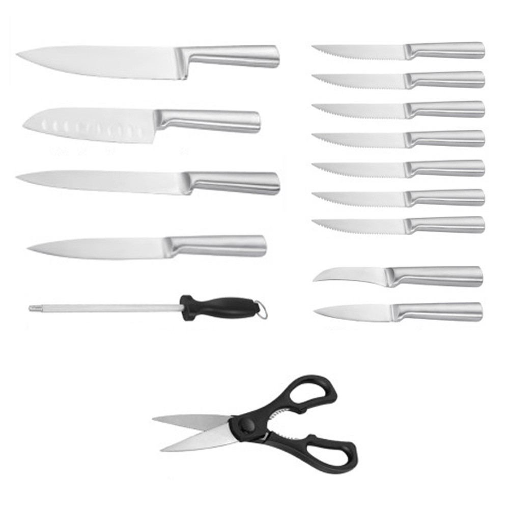 Sada obsahuje 6 steakových nožů, šéfkuchařský nůž, japonský nůž, univerzální nůž, 2 nože na loupání, 6 steakových nožů, brousek, nůžky a dřevěný blok.