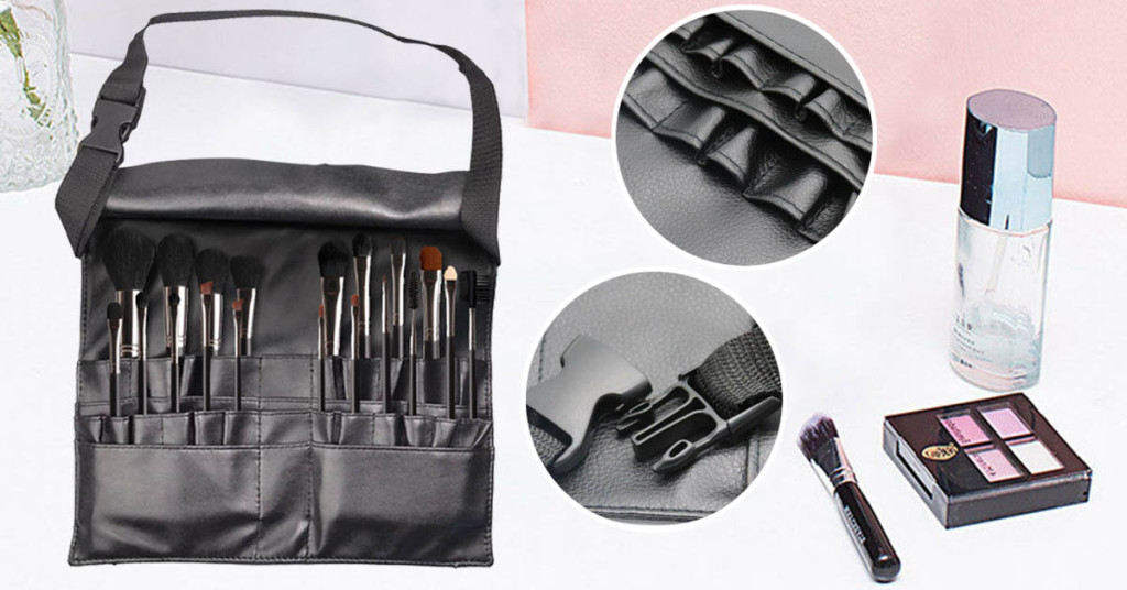 Černé pouzdro s koženým efektem je mimořádně praktické – každý štětec má své vlastní místo, takže se vyhnete nepořádku na kosmetickém stolku nebo v taštičce. Díky nastavitelnému pásku kolem pasu si jej snadno připnete a budete mít volné ruce při líčení.
