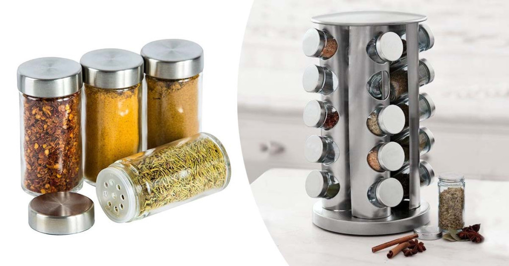 Prostorově úsporný stojan má průměr jen 22 cm, ale je stabilní a snadno otočný. Skleněné dózičky mají objem 80 ml, ideální pro většinu koření. V balení najdete vše potřebné.
