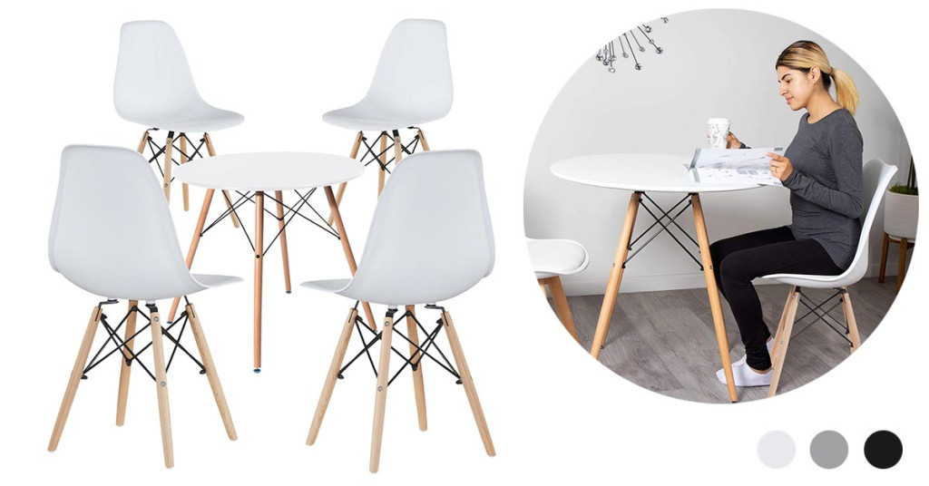 Díky kombinaci kvalitních materiálů – plastových sedáků, dřevěných nohou a kovových výztuh – nabízí jídelní set dlouhou životnost a spolehlivost. Židle unesou až 100 kg a jejich snadno udržovatelný povrch usnadňuje každodenní péči.