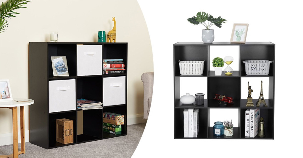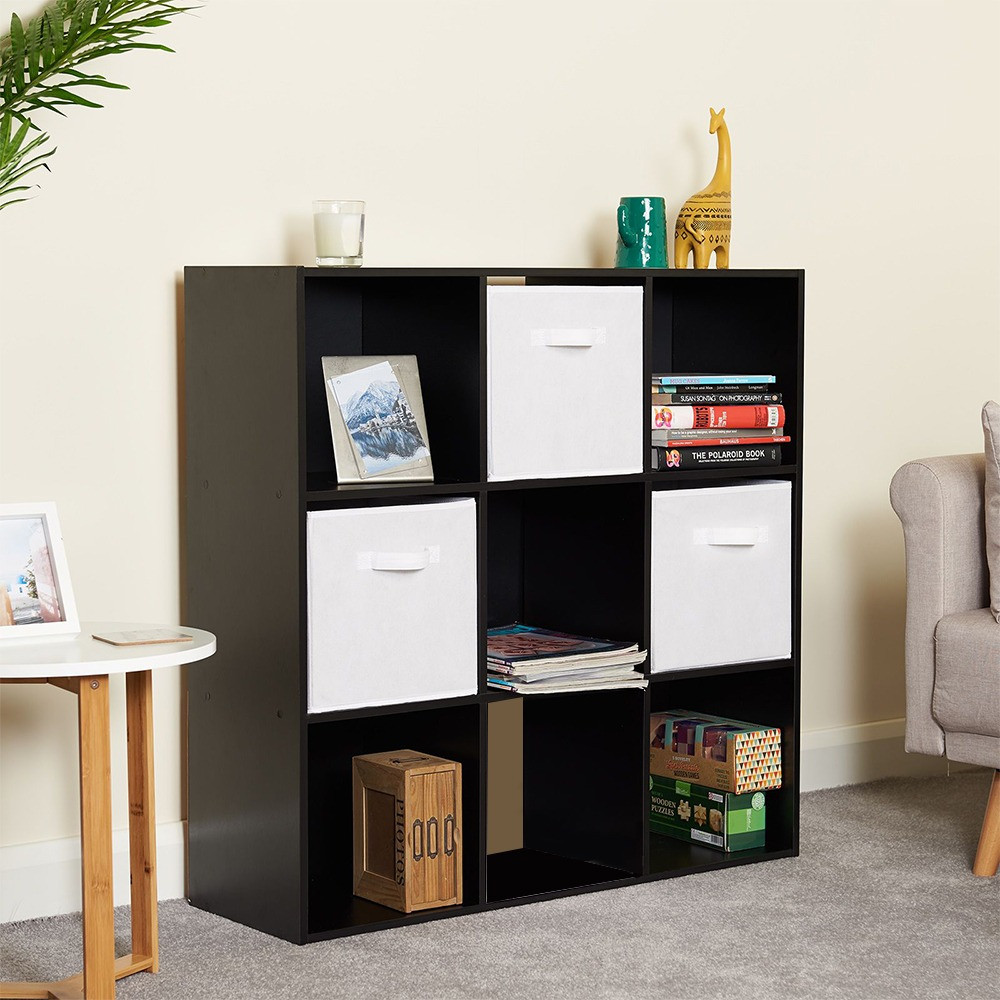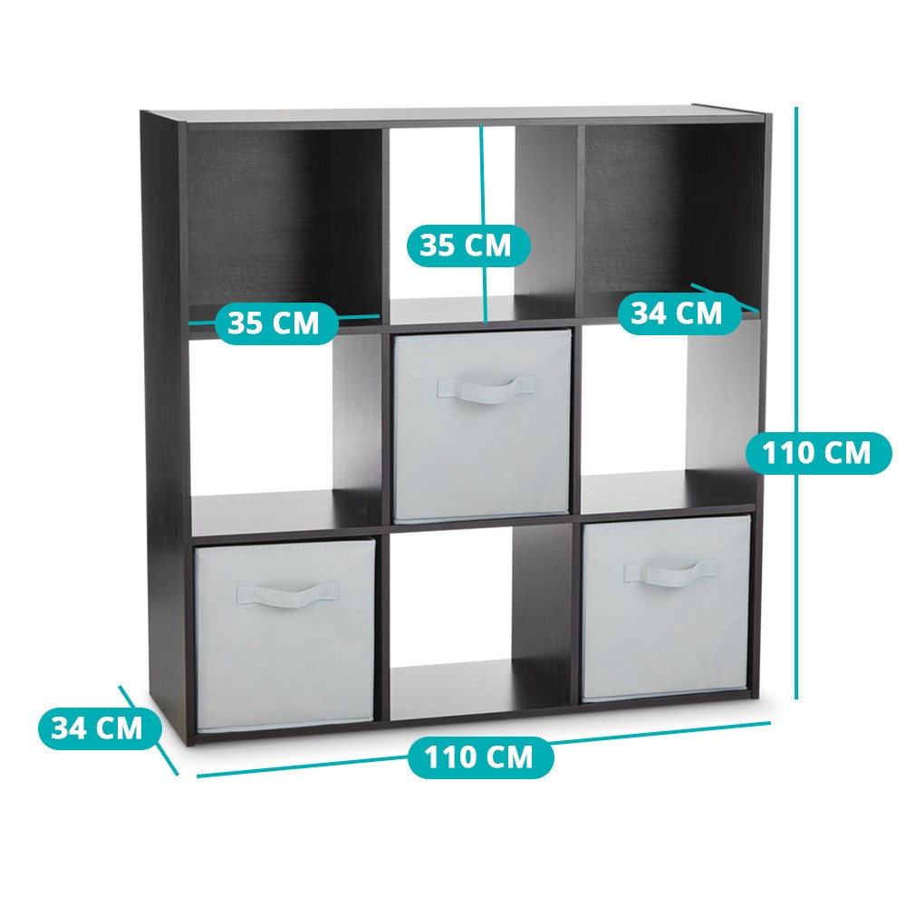Tato polička s 9 přihrádkami a třemi textilními koši je ideální volbou, pokud chcete mít své věci přehledně a vkusně uložené. Knihy, hračky, oblečení nebo dekorace – vše má své místo a přitom nepůsobí přeplněně.