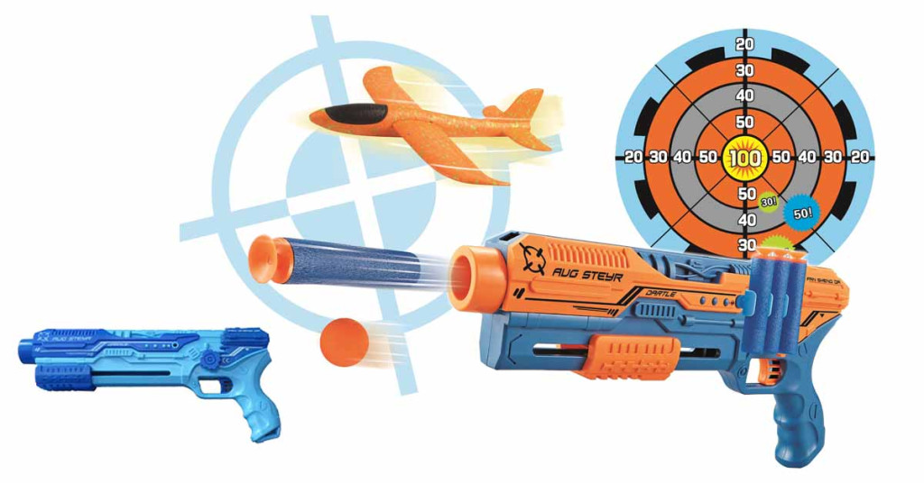 Střelba na cíl s pěnovými náboji – Díky měkkým pěnovým střelám mohou děti bezpečně trénovat přesnou mušku a soutěžit v získávání bodů na terči. Vystřelování letadla – Speciální funkce umožňuje pistoli vystřelit pěnové letadlo, které může letět přímo nebo provádět akrobatické otočky. Směr letu lze snadno nastavit, což přináší neustálé výzvy!