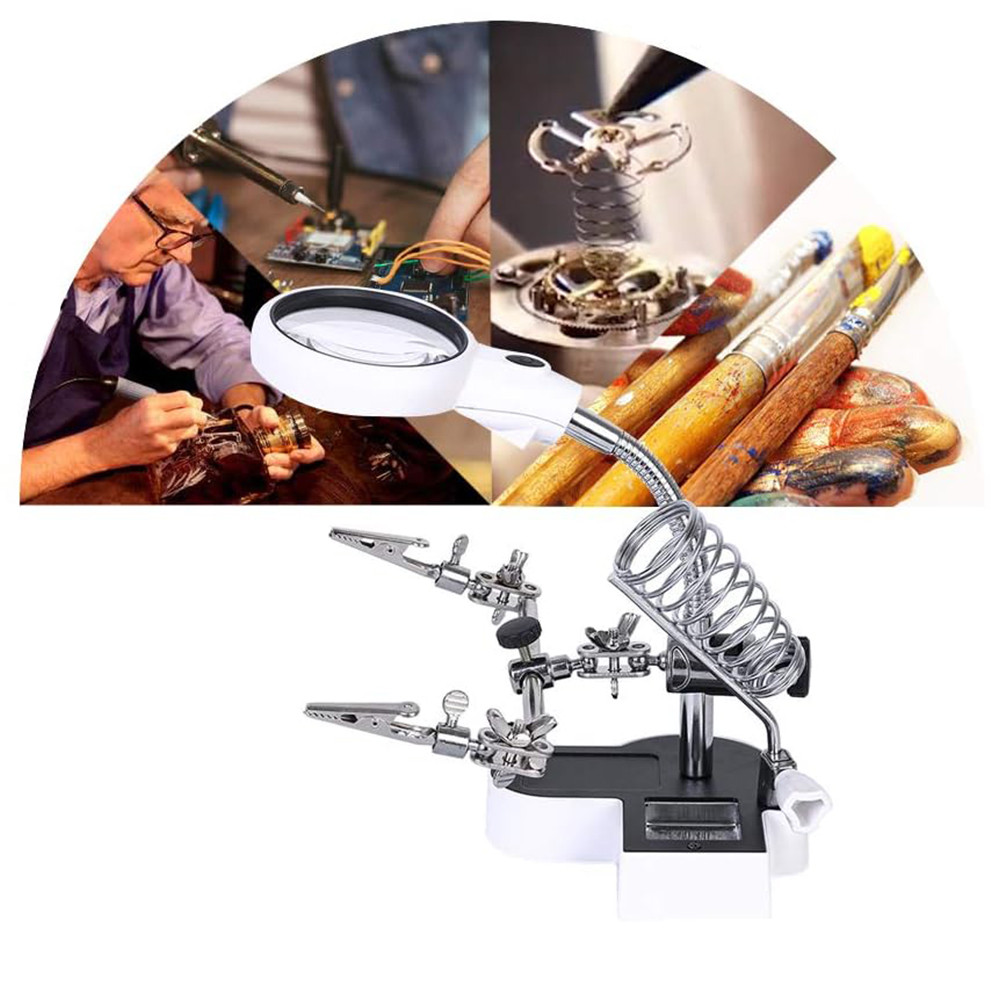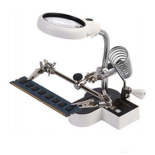 Nastavitelné kovové svorky „třetí ruky“ pevně uchopí součástky, zatímco obě vaše ruce zůstanou volné pro práci. Ohebný rameno s lupou lze snadno nastavit do požadované polohy. Integrovaný spirálový držák na páječku se postará o bezpečné a praktické odložení nástroje během práce.