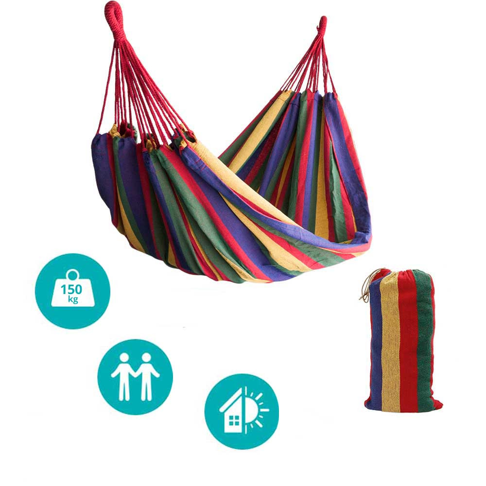 Dvojmístná houpací síť je perfektní volba na zahradu, terasu i do interiéru. Lze ji bezpečně upevnit ke stromu nebo sloupu a rychle si vytvoříte svůj koutek klidu kdekoli.
