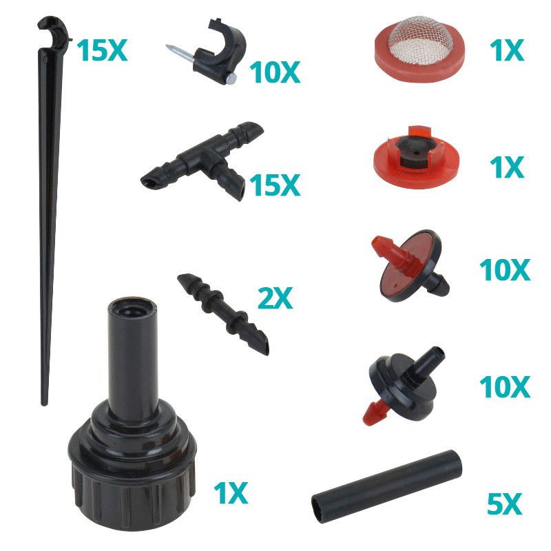 Koncovka s regulačním ventilem a filtrem umožňuje přesnou regulaci množství vody. Díky upevňovacím kolíkům a svorkám zůstane systém pevně na svém místě a instalace je rychlá a jednoduchá.