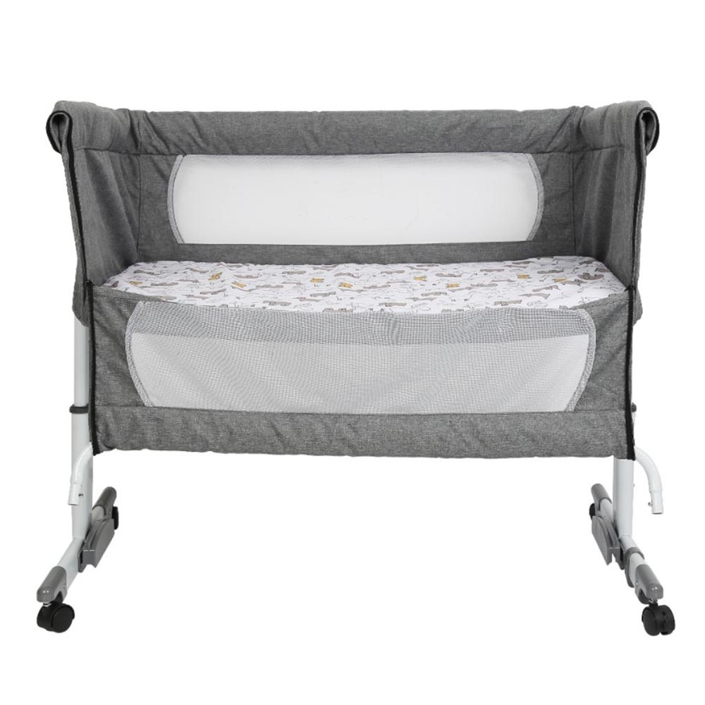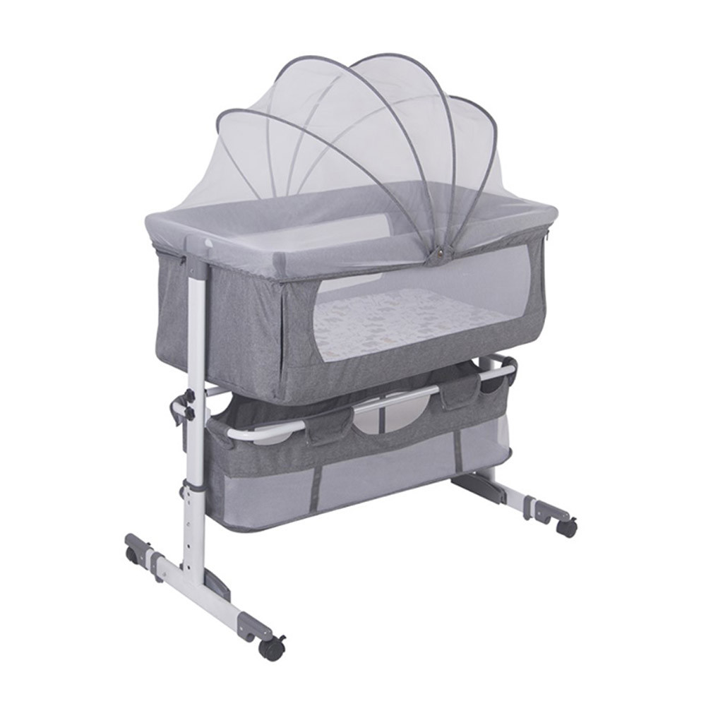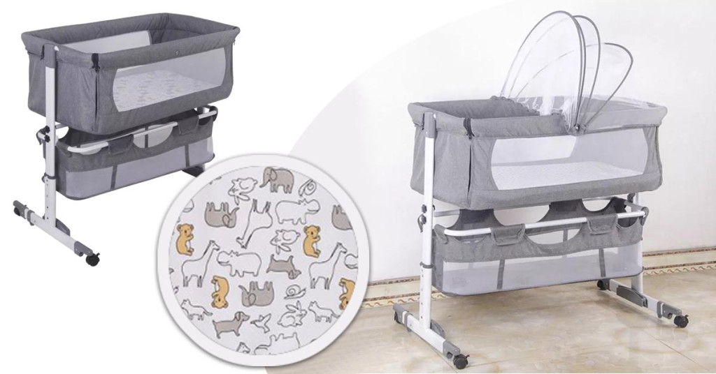 Postýlka nabízí čtyři úrovně nastavení výšky, takže ji lze snadno přizpůsobit výšce jakékoliv postele. Upevňovací popruh zajišťuje stabilní připevnění, zatímco sklopná bočnice usnadňuje přístup k dítěti. Pro noční houpání lze zadní nohy sklopit, což miminku poskytne uklidňující pohyb.