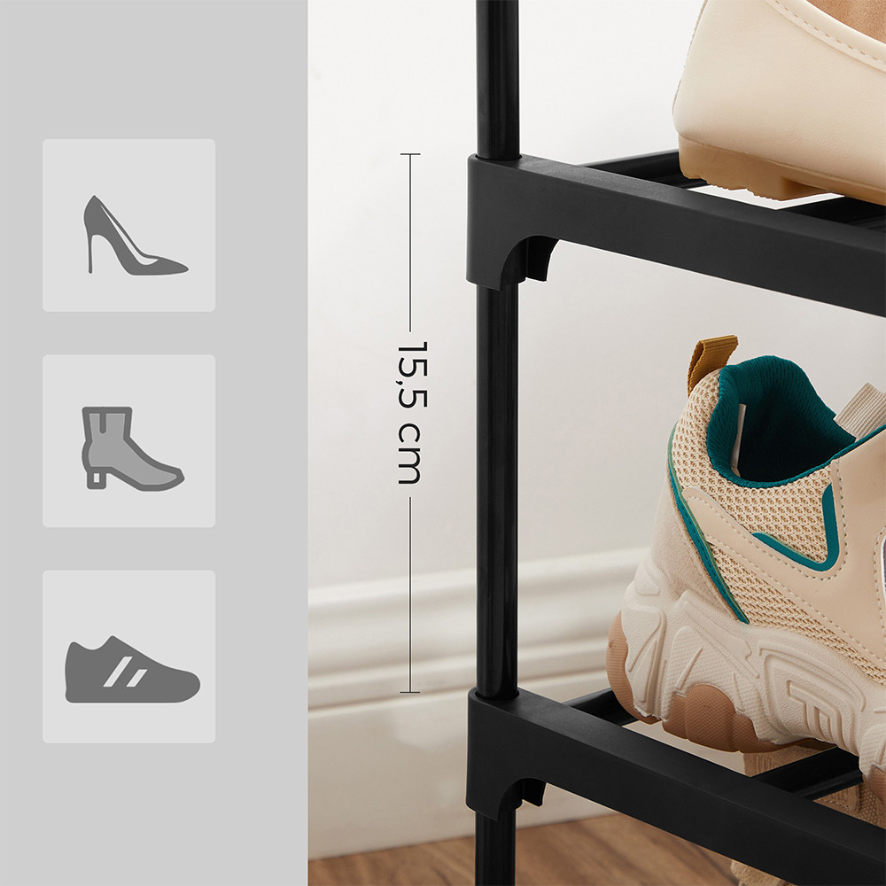 Silné kovové trubky a pevné plastové spojky zajišťují odolnost a stabilitu. Každá police unese až 5 kg, takže vaše boty budou vždy bezpečně a úhledně uloženy.
