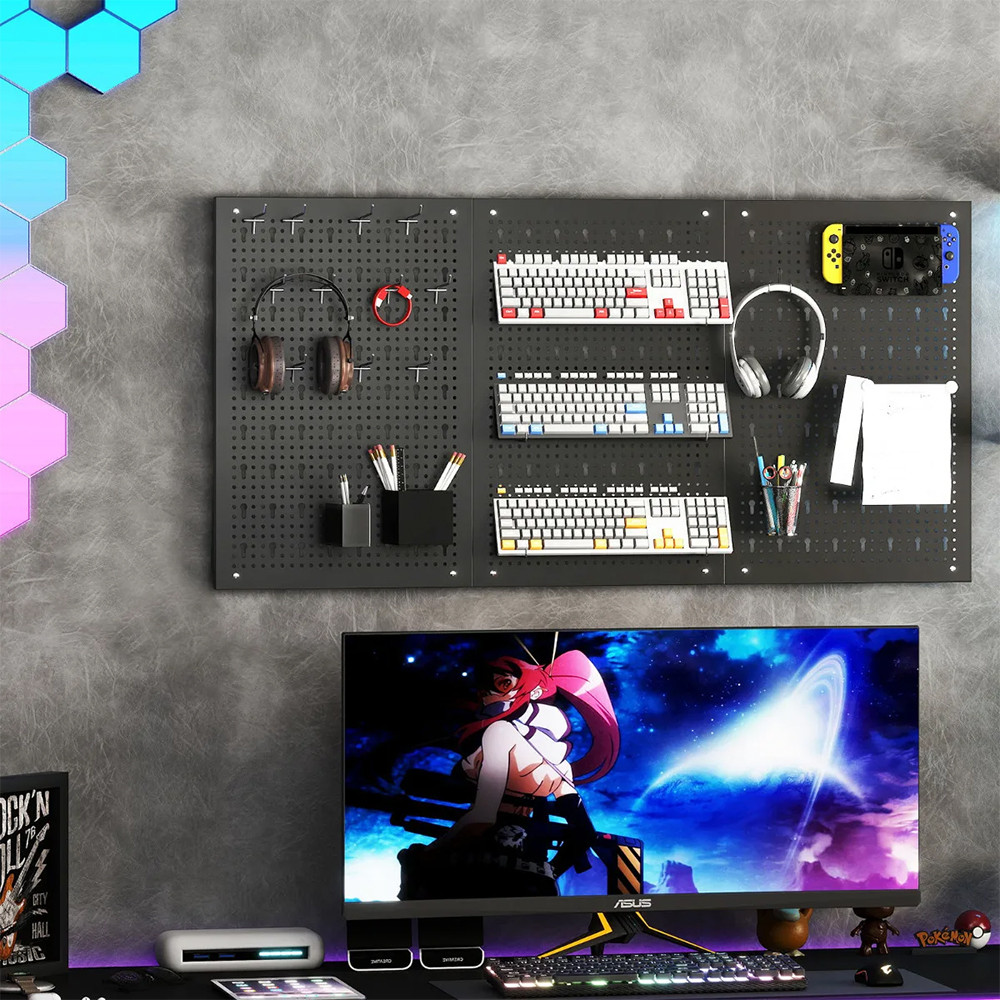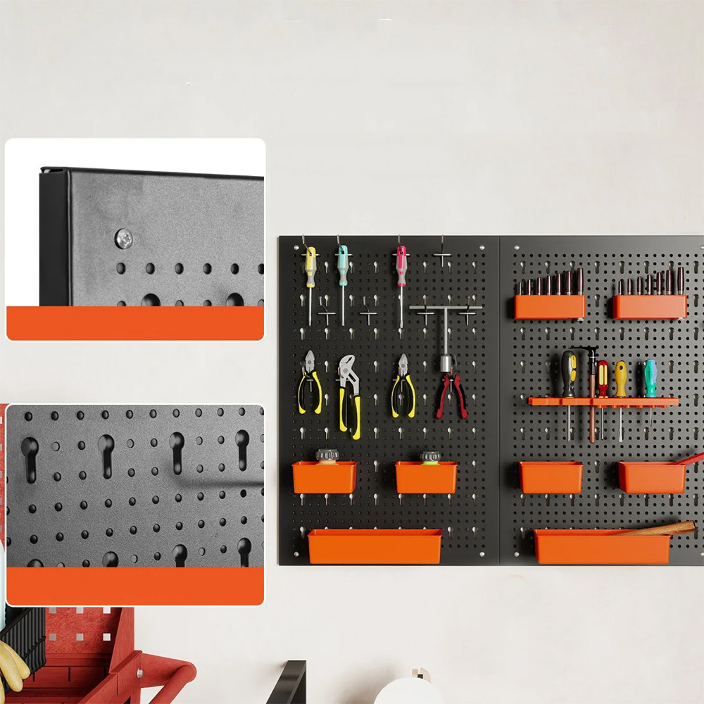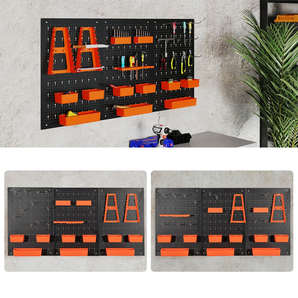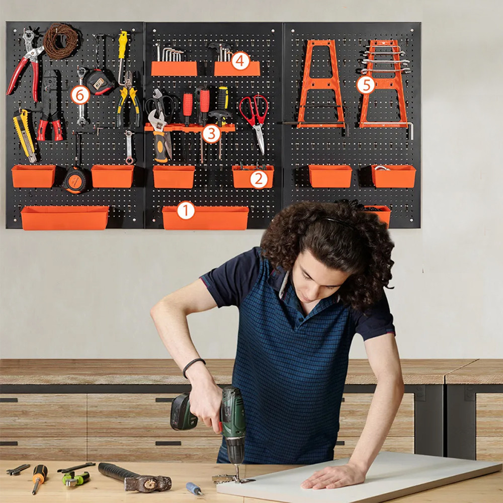 Pravidelně rozmístěné otvory umožňují rozmístit přihrádky, háčky a držáky podle potřeby. Místo zde najdou klíče, šroubováky, vrtáky i menší nářadí.
