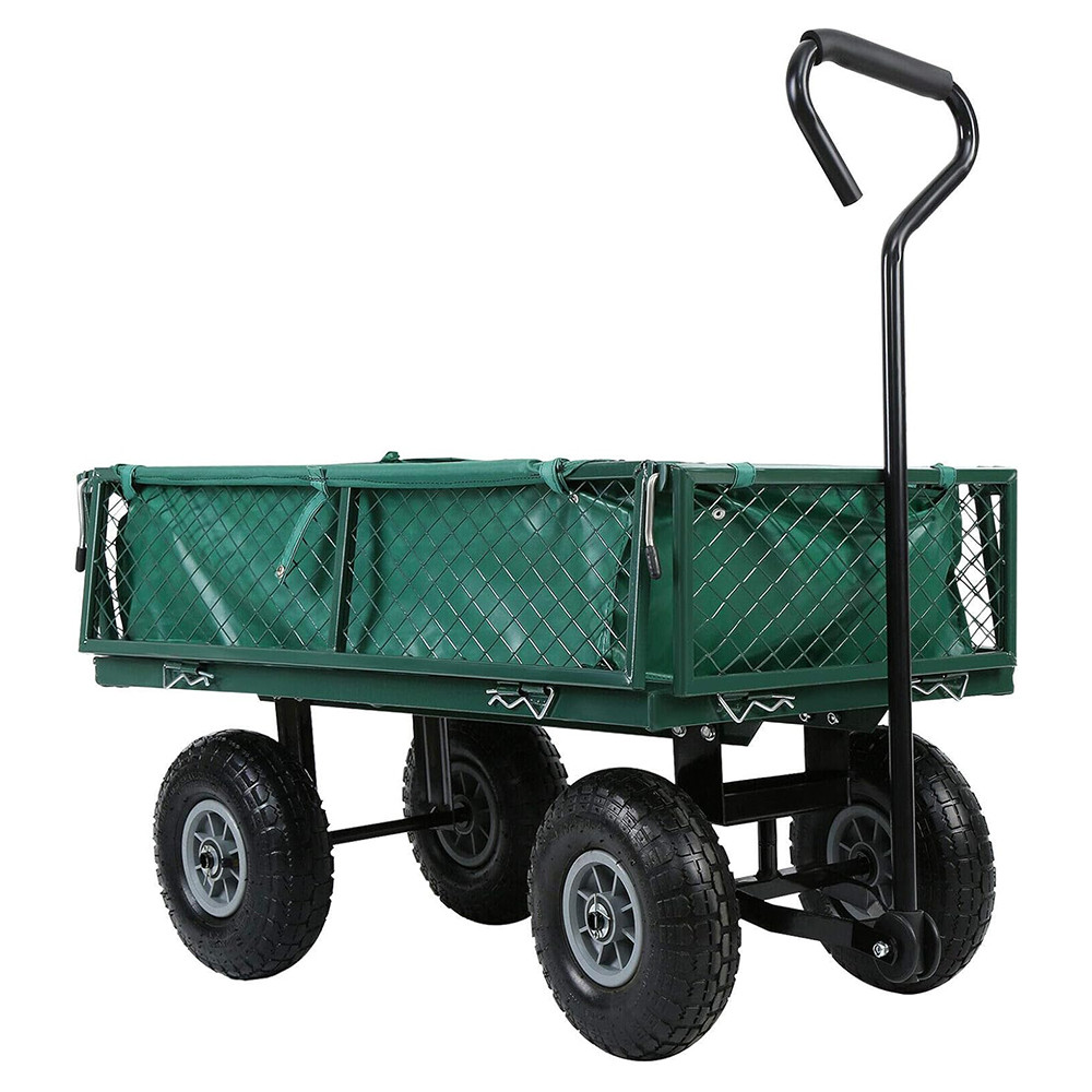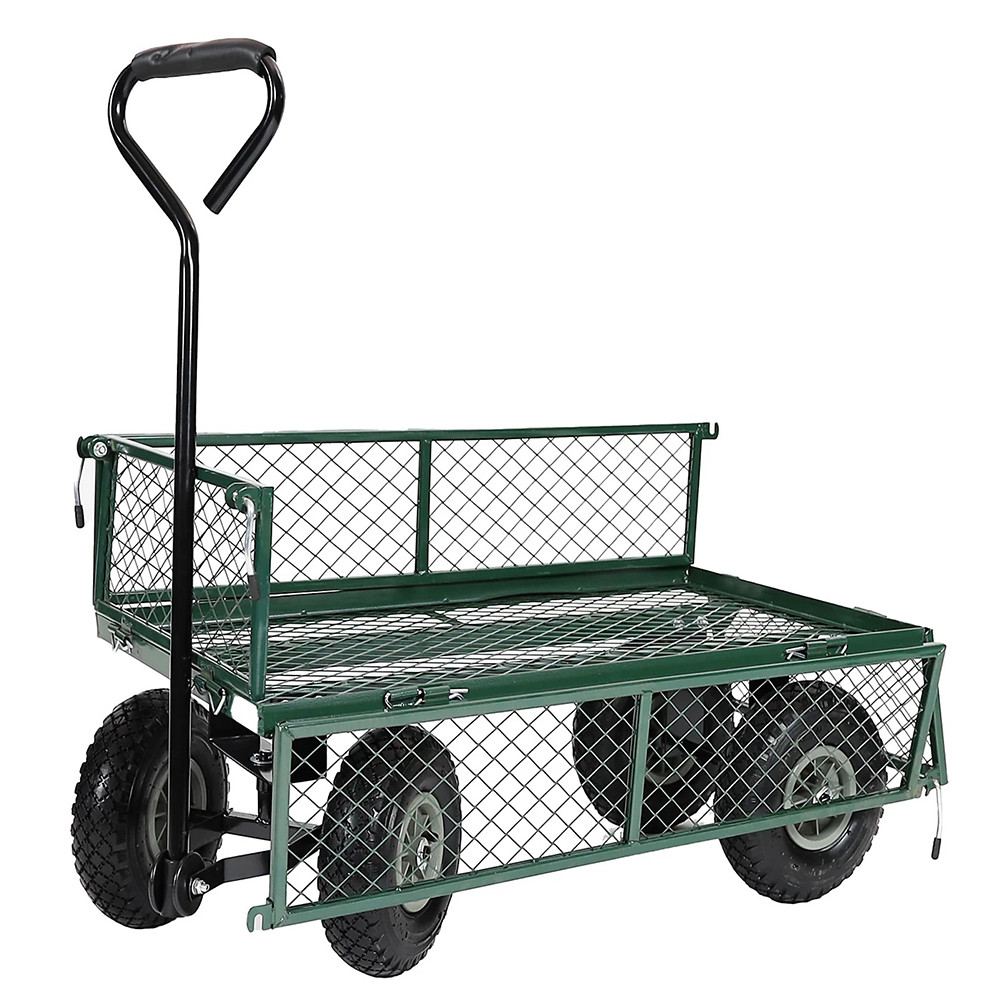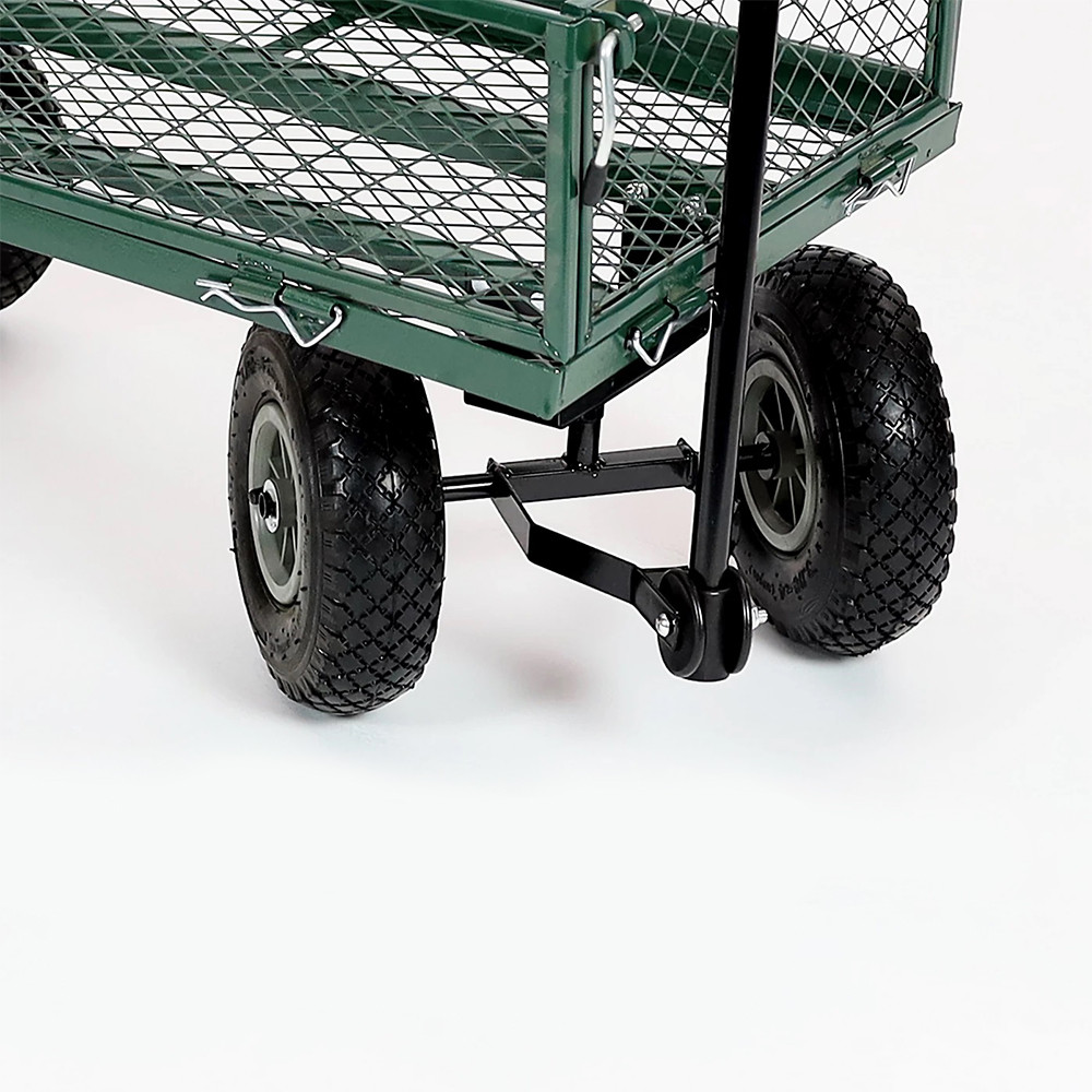 Tento kovový zahradní vozík je ideálním pomocníkem při práci na zahradě – skvěle poslouží pro přepravu dřeva, zeminy nebo jiného nákladu. Mřížkovaná konstrukce zajišťuje stabilní převoz, zatímco sklopné bočnice usnadňují nakládání i vykládání těžších předmětů.