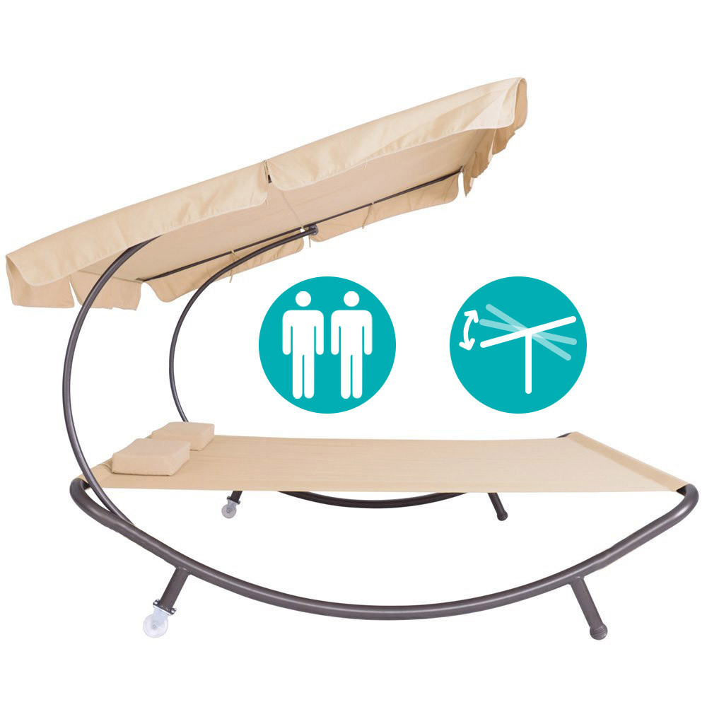 Toto dvoulůžkové zahradní lehátko je skvělou volbou, pokud si chcete s partnerem odpočinout na čerstvém vzduchu. Nastavitelné stínítko chrání před sluncem, kolečka umožňují snadný přesun a přiložené polštáře zvyšují pohodlí. Ideální pro větší terasy nebo zahrady.