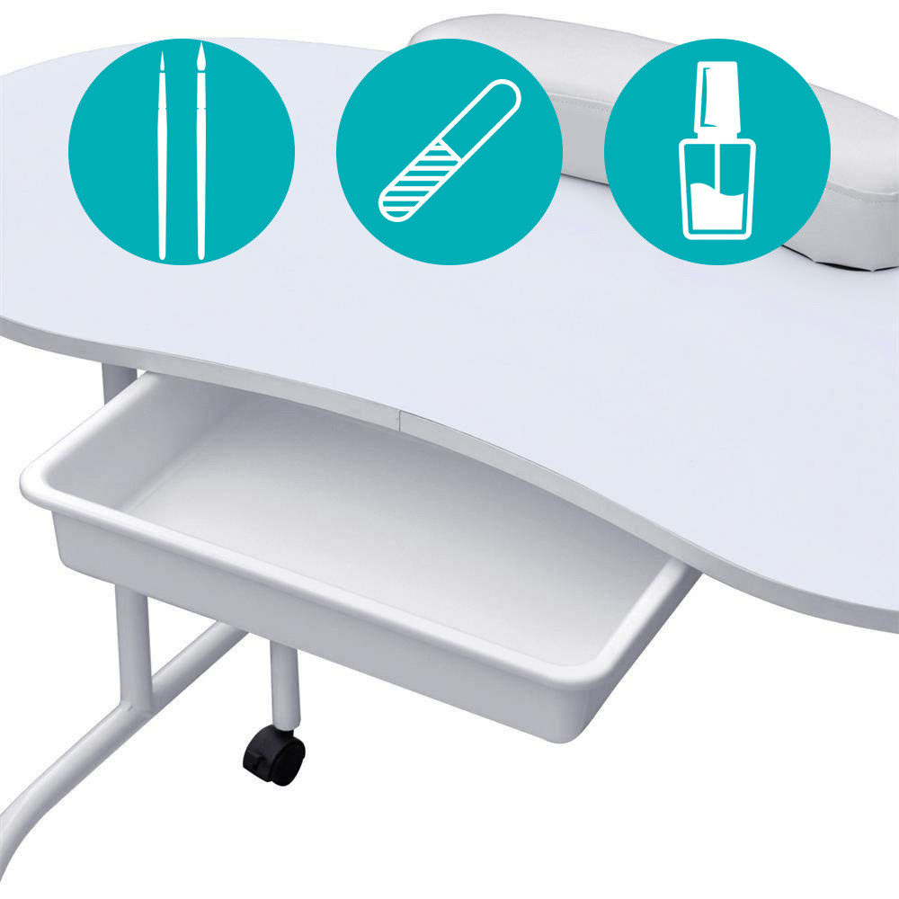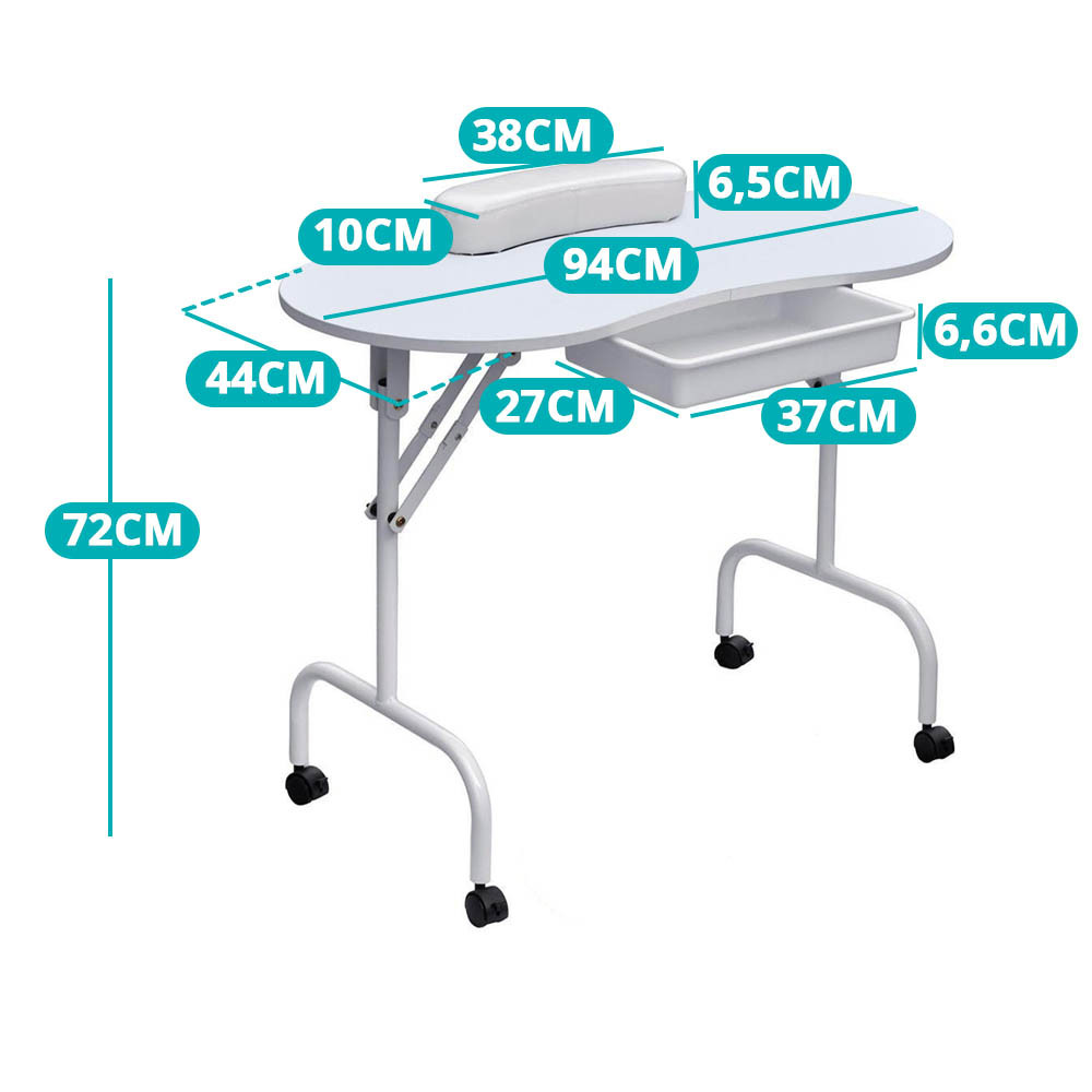 Přenosný manikúrní stůl se zásuvkou je skvělým řešením do salonu i pro mobilní nehtové služby. Díky skládacím nohám a voděodolné tašce se snadno přenáší a zabírá minimum místa.