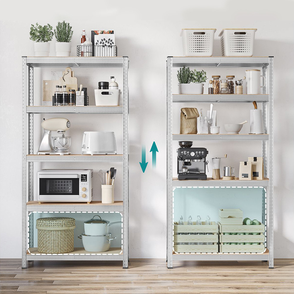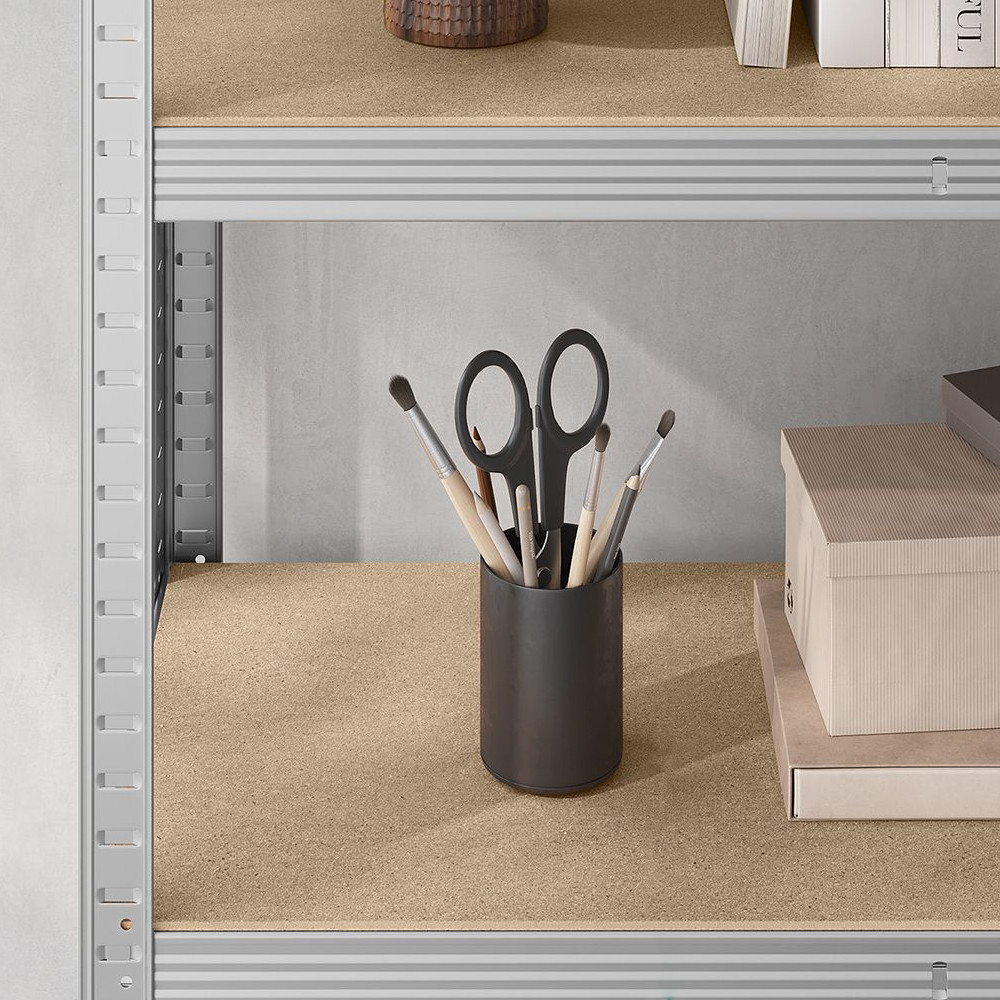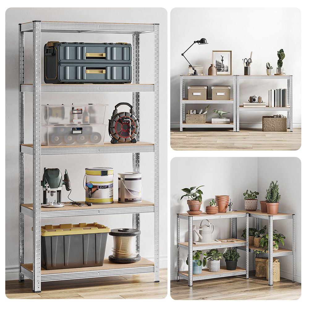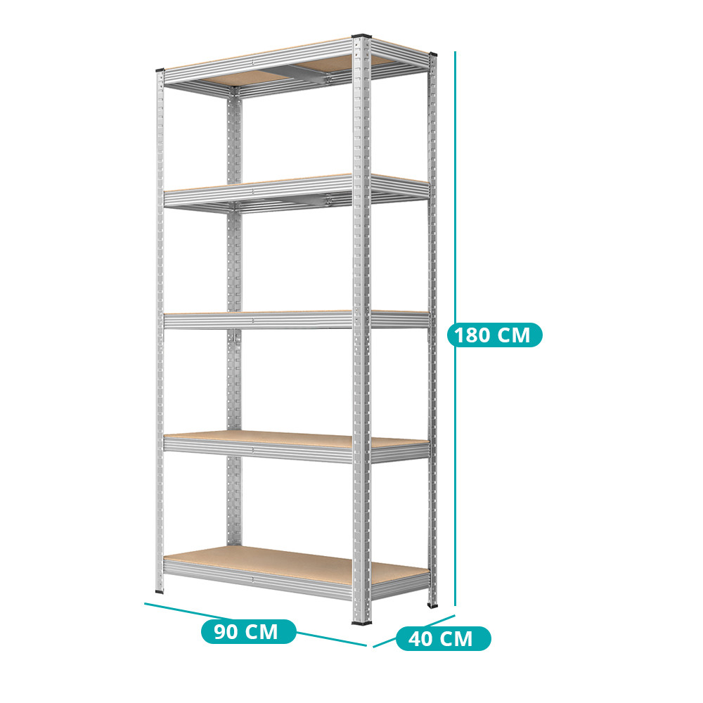 Stříbrný ocelový rám a MDF desky dodávají policím praktický a čistý vzhled. Hodí se do každé dílny nebo úložného prostoru a přispívá k lepší organizaci místa.