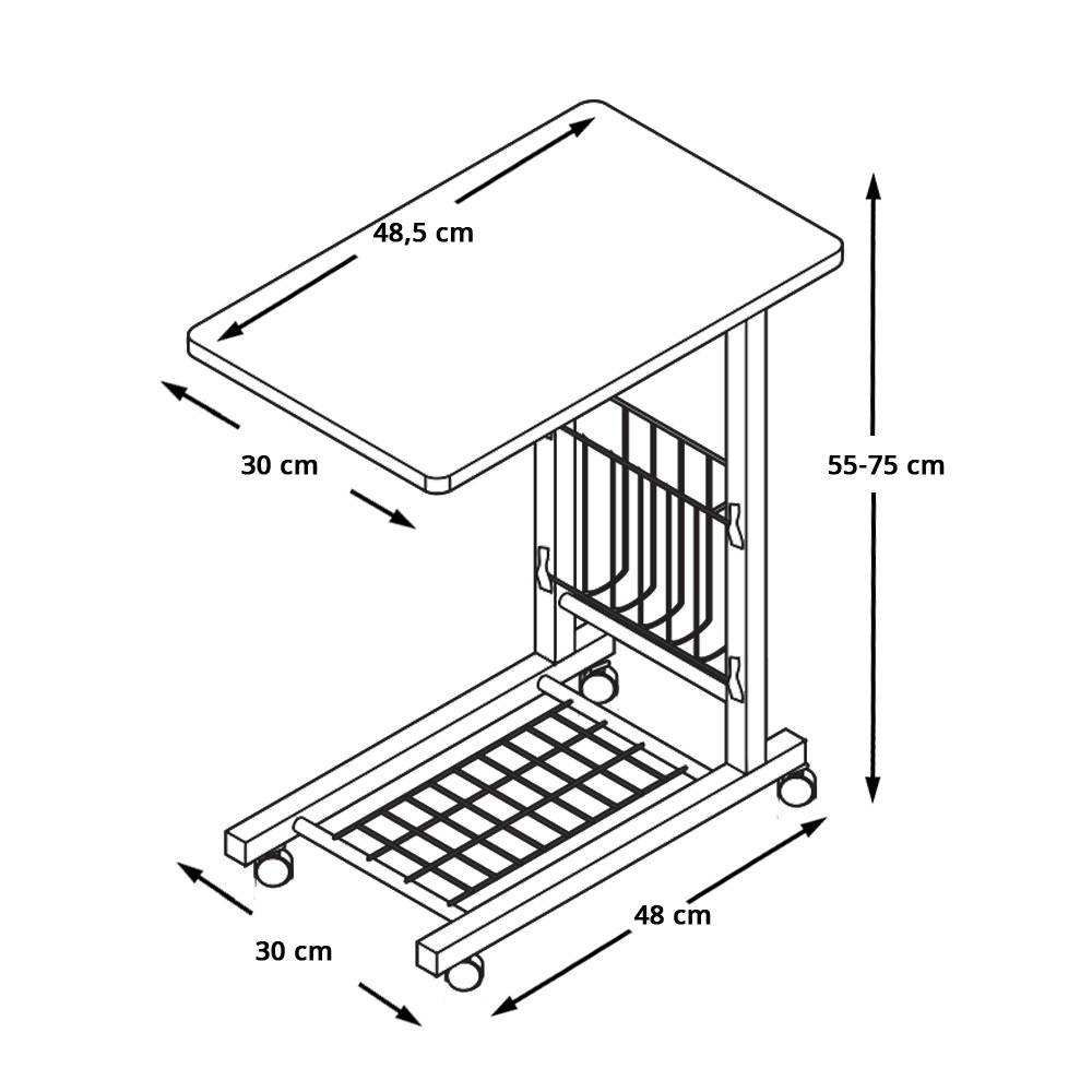 Robustní kovový rám a kvalitní dřevěná deska zajišťují dlouhou životnost stojanu. Nabízí kompaktní, ale prostorné úložné možnosti: na spodní polici můžete umístit drobné předměty, zatímco boční přihrádka je ideální na knihy, časopisy nebo další příslušenství.