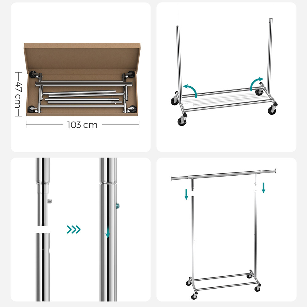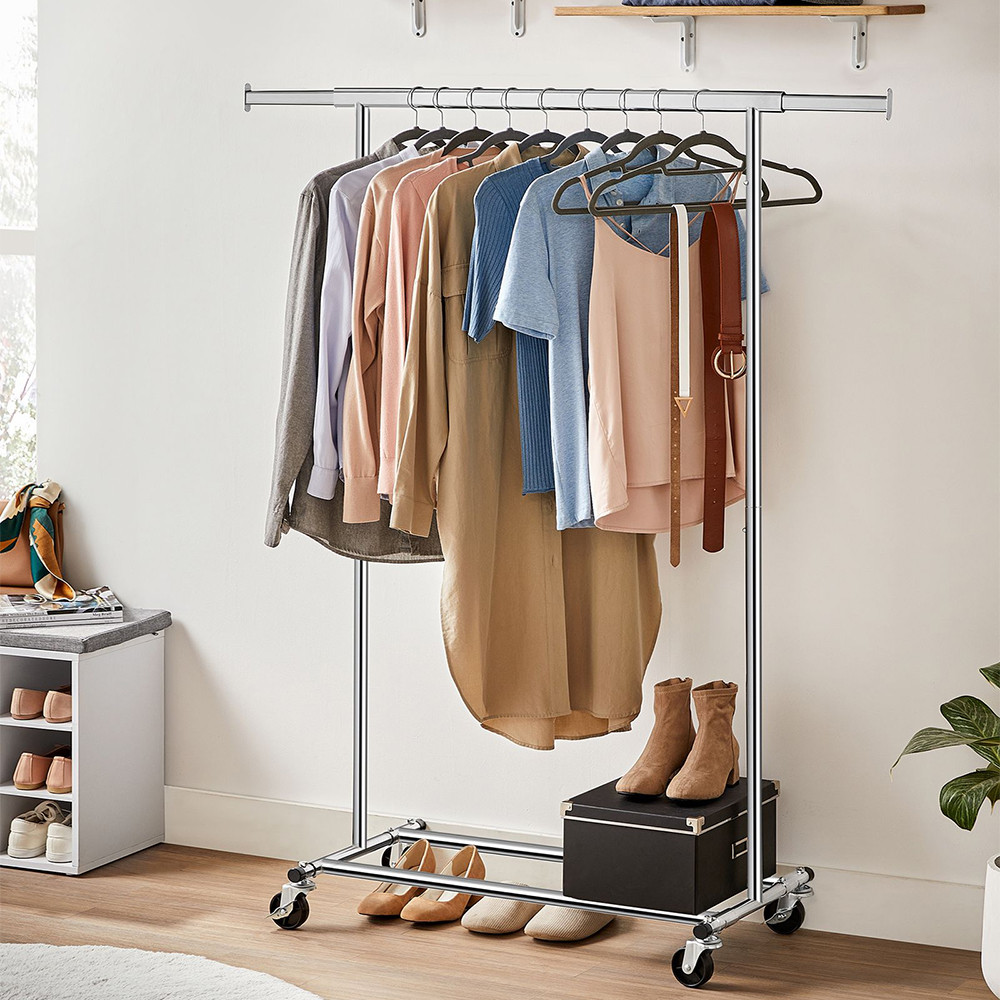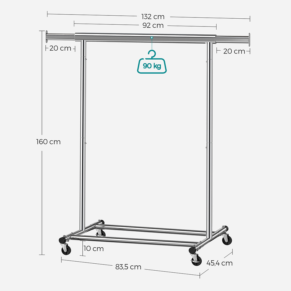 Tento odolný pojízdný stojan na oblečení je ideální volbou, pokud chcete mít kabáty, oblečení nebo i tašky přehledně uspořádané. Ať už jej umístíte do ložnice, šatny nebo prádelny, vše budete mít vždy po ruce.