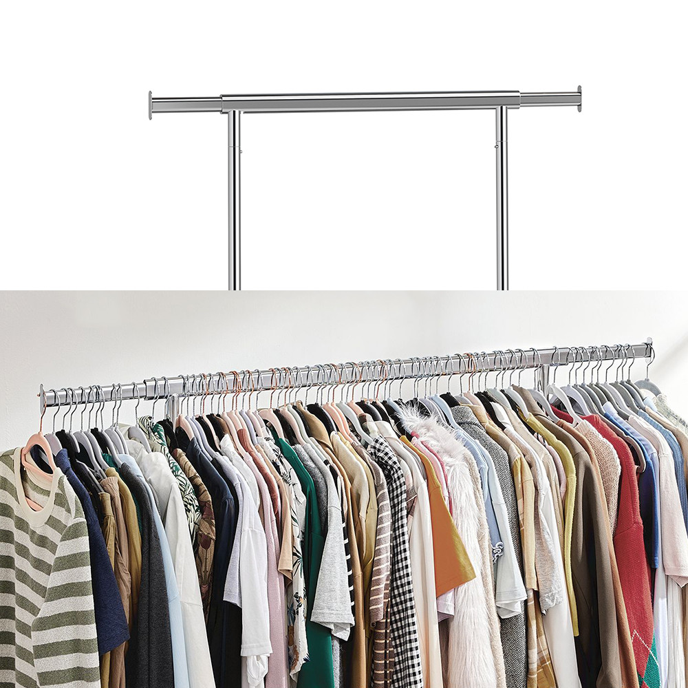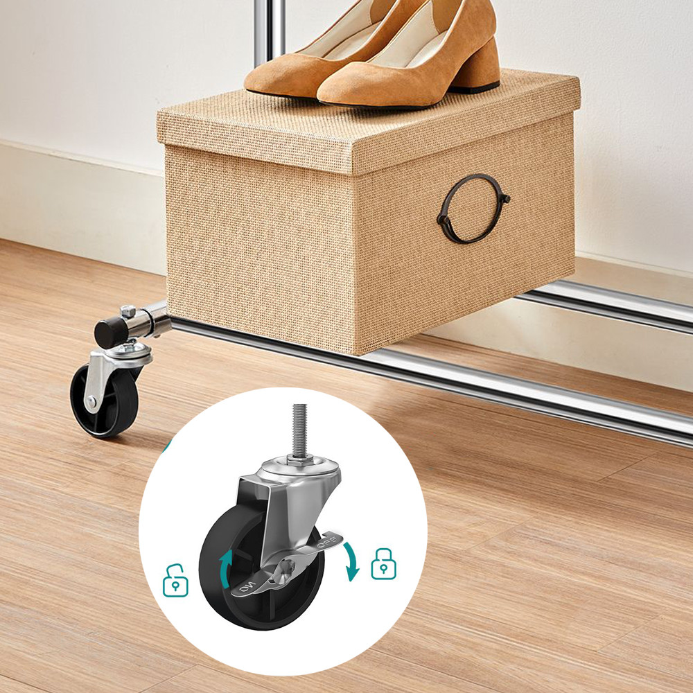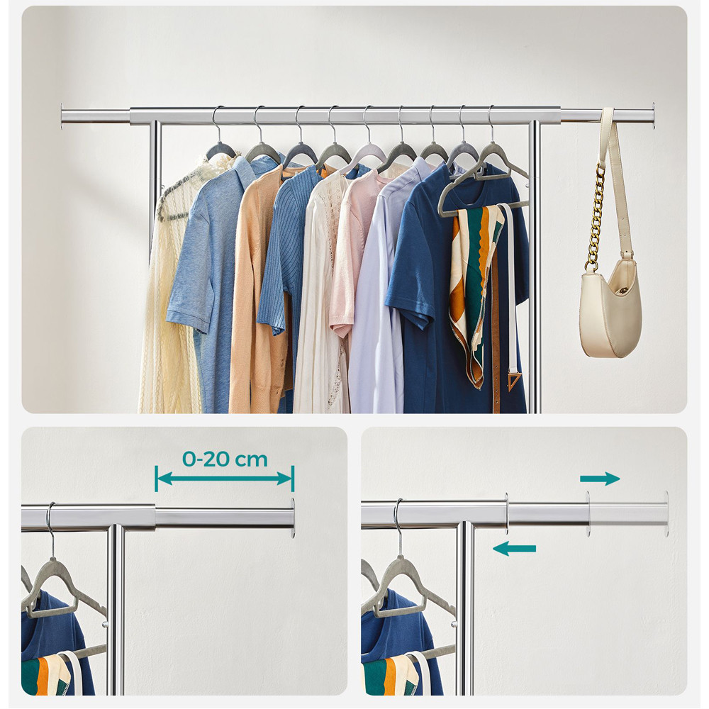 Horní tyč lze na obou koncích prodloužit o 20 cm, čímž získáte více prostoru pro oděvy, a na koncích pohodlně zavěsíte tašky či šátky. Pod spodní tyče můžete umístit úložné boxy.