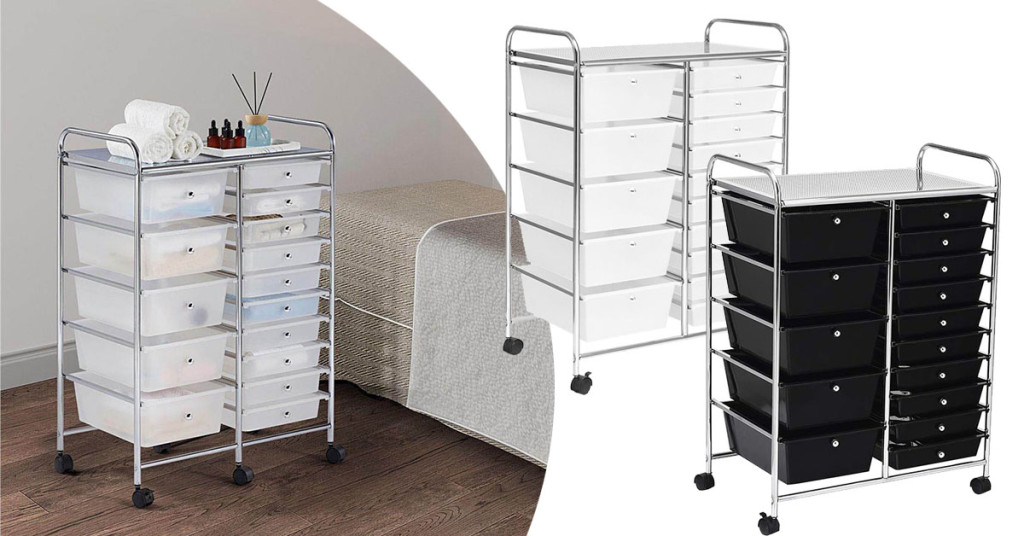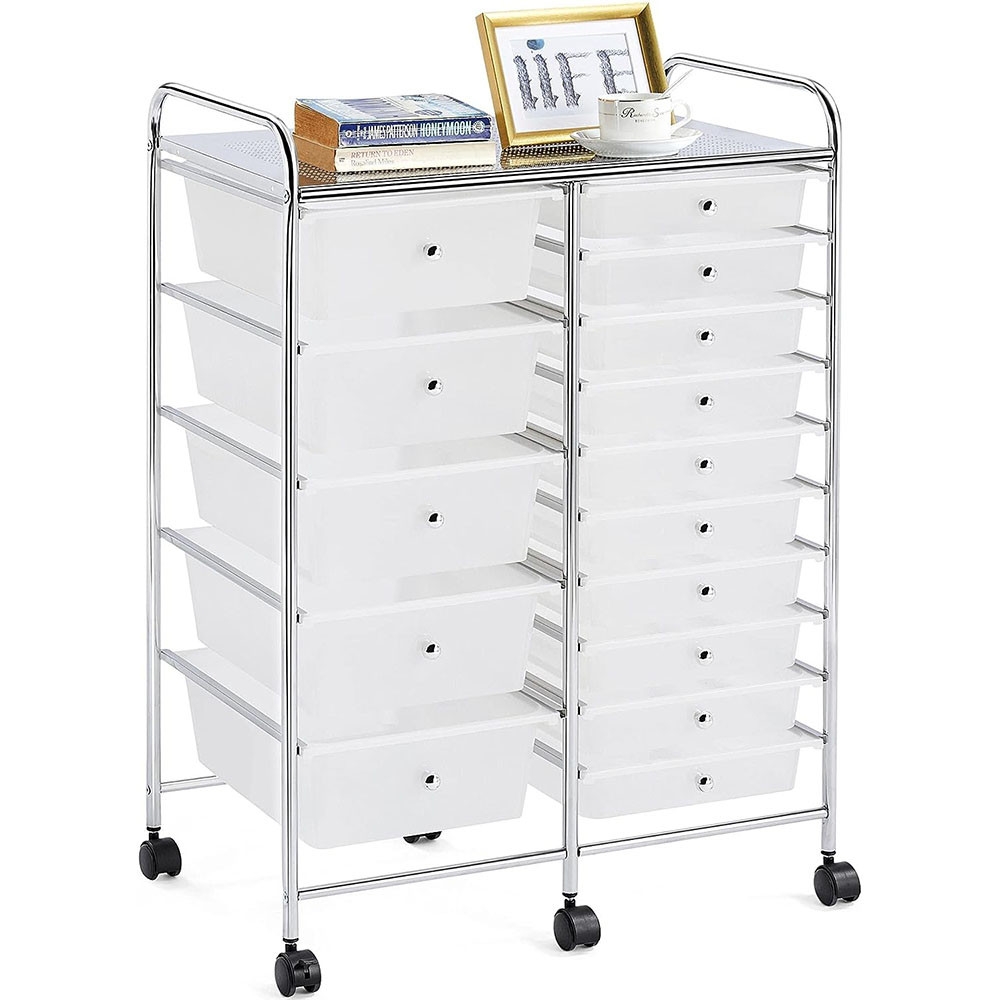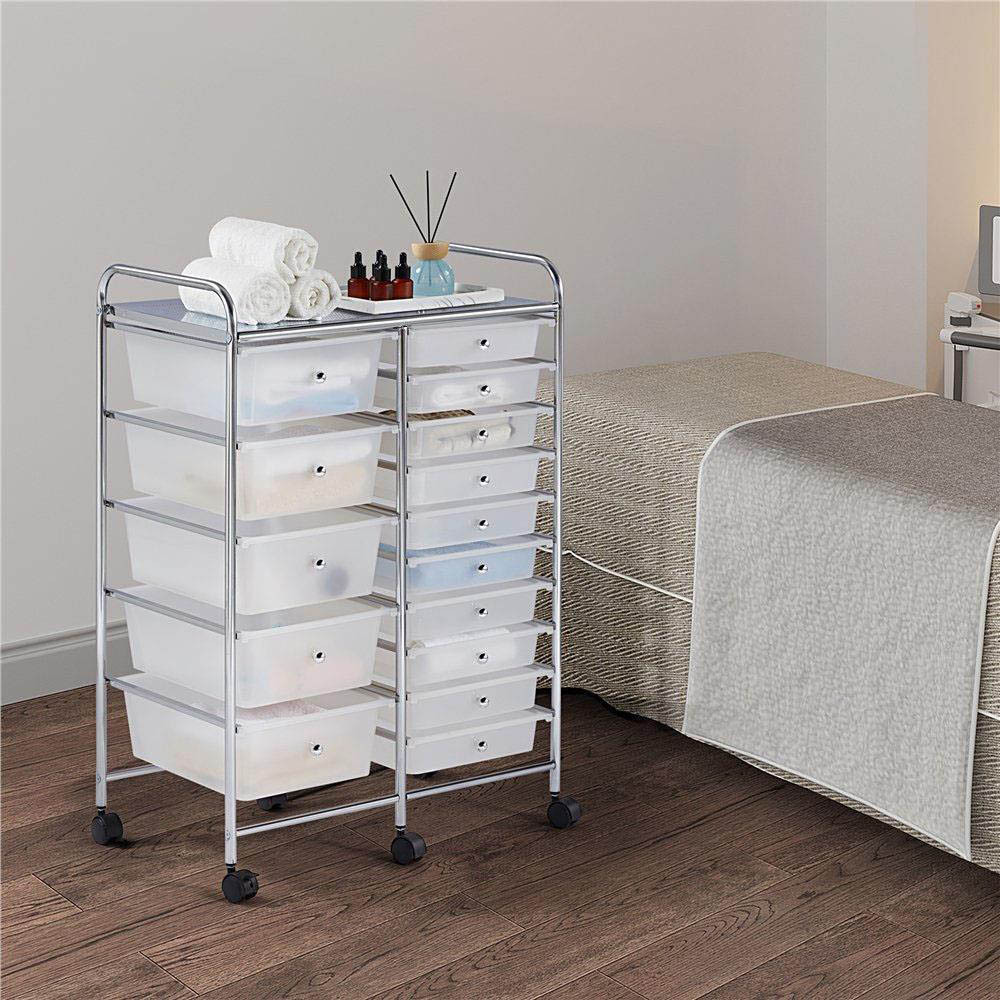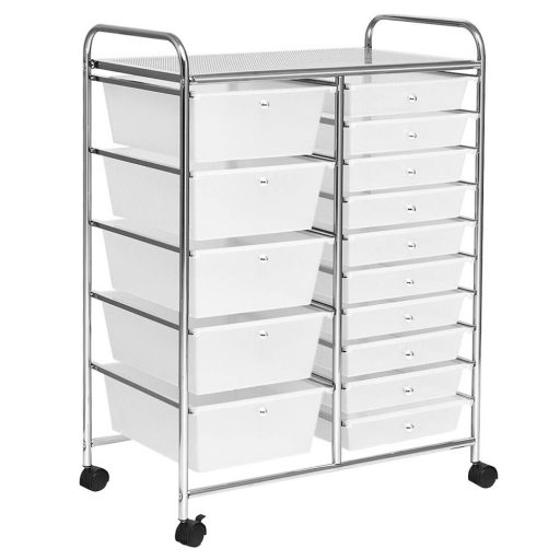 Úložný vozík disponuje celkem 15 zásuvkami, které umožňují organizovat věci podle kategorií. Menší zásuvky jsou ideální pro drobné předměty, kancelářské potřeby nebo kosmetiku, zatímco větší zásuvky pohodlně pojmou i objemnější předměty.