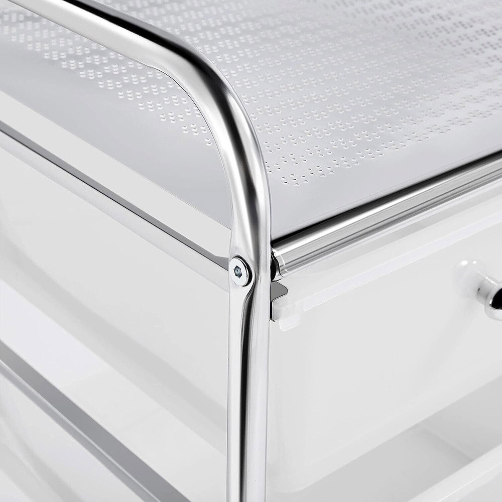 Chromovaný rám a minimalistický design dodávají vozíku stylový vzhled, díky kterému snadno zapadne do jakéhokoliv interiéru. Ať už jej umístíte do domácí kanceláře, ke kosmetickému stolku nebo do salonu krásy, vždy bude praktickým a estetickým doplňkem.