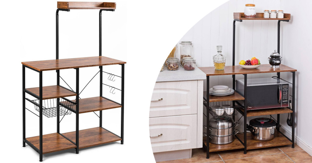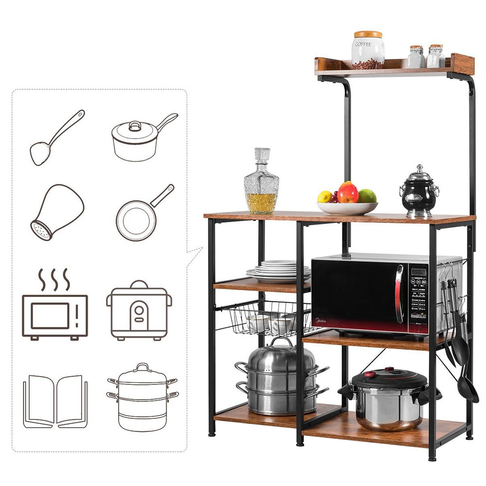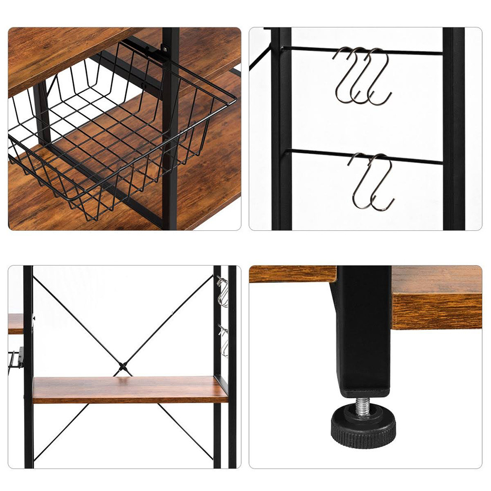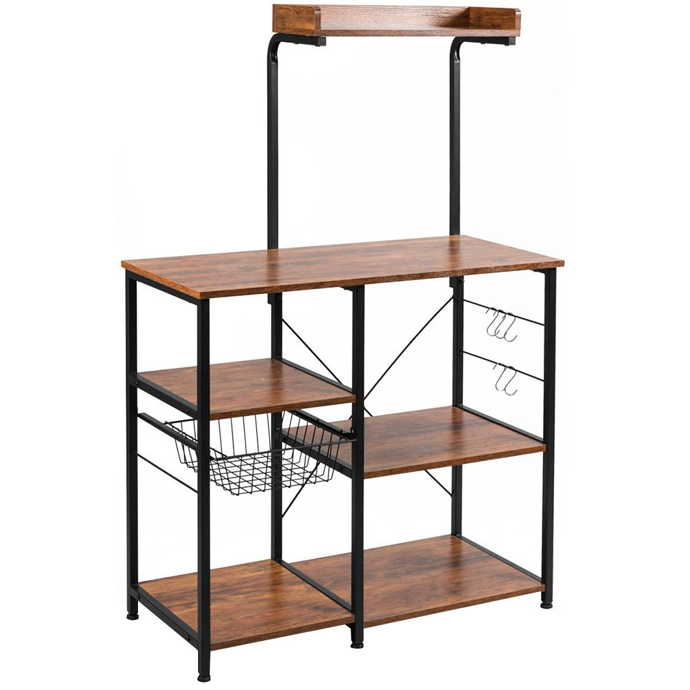 Stojan s tmavě hnědými policemi a robustním kovovým rámem poskytuje stylový a využitelný prostor pro kuchyňské potřeby. Snadno na něj uložíš menší spotřebiče, hrnce či suroviny.