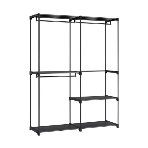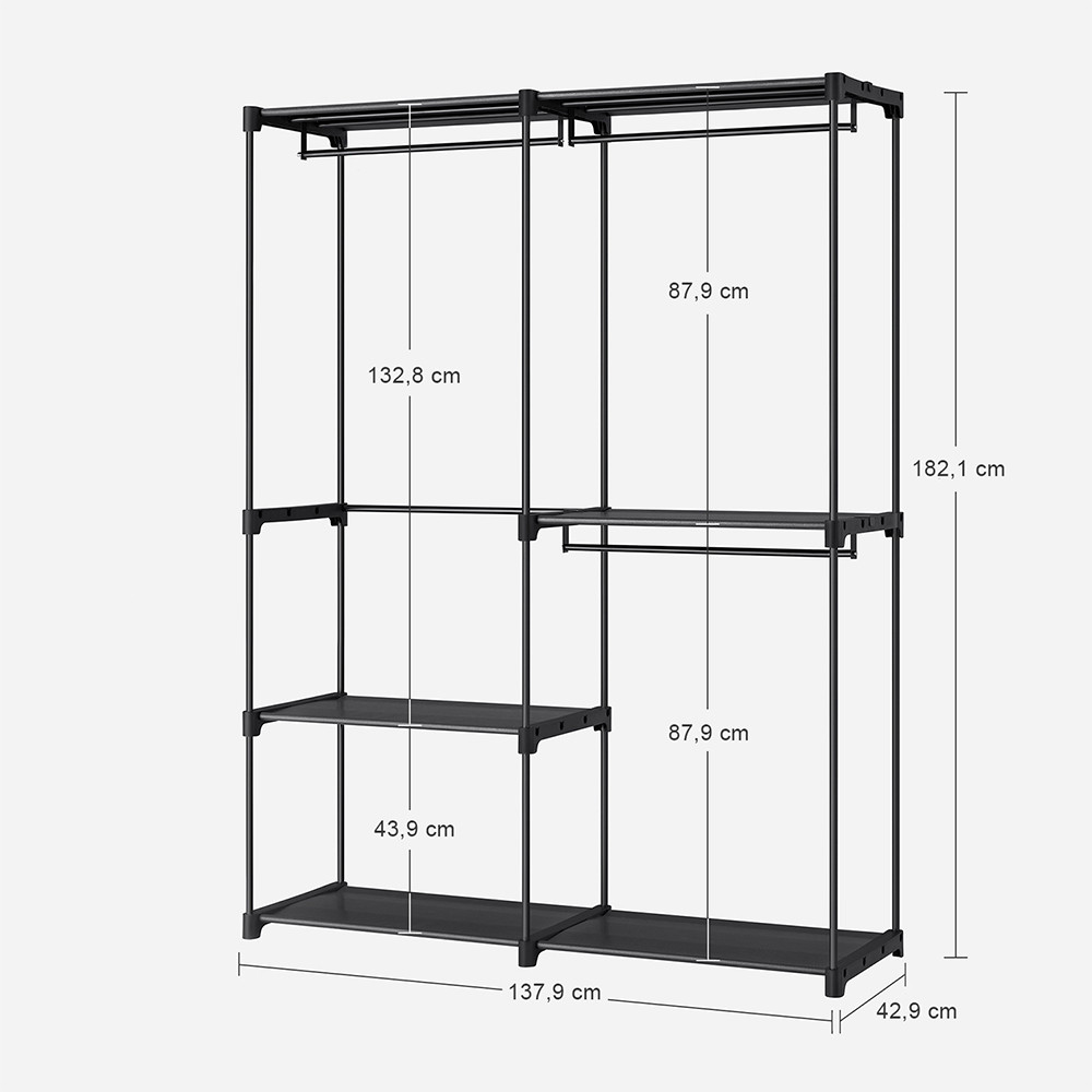 Masivní rám z ocelových trubek o průměru 16 mm a zesílené plastové spojky poskytují pevný základ pro každodenní použití. Nosnost závěsných tyčí je až 20 kg, takže na ně můžete bez obav pověsit i silnější kabáty nebo saka.