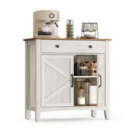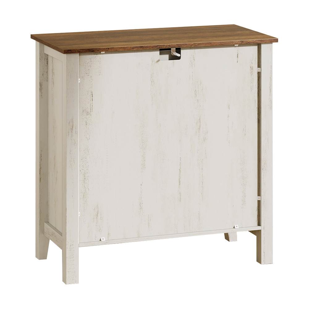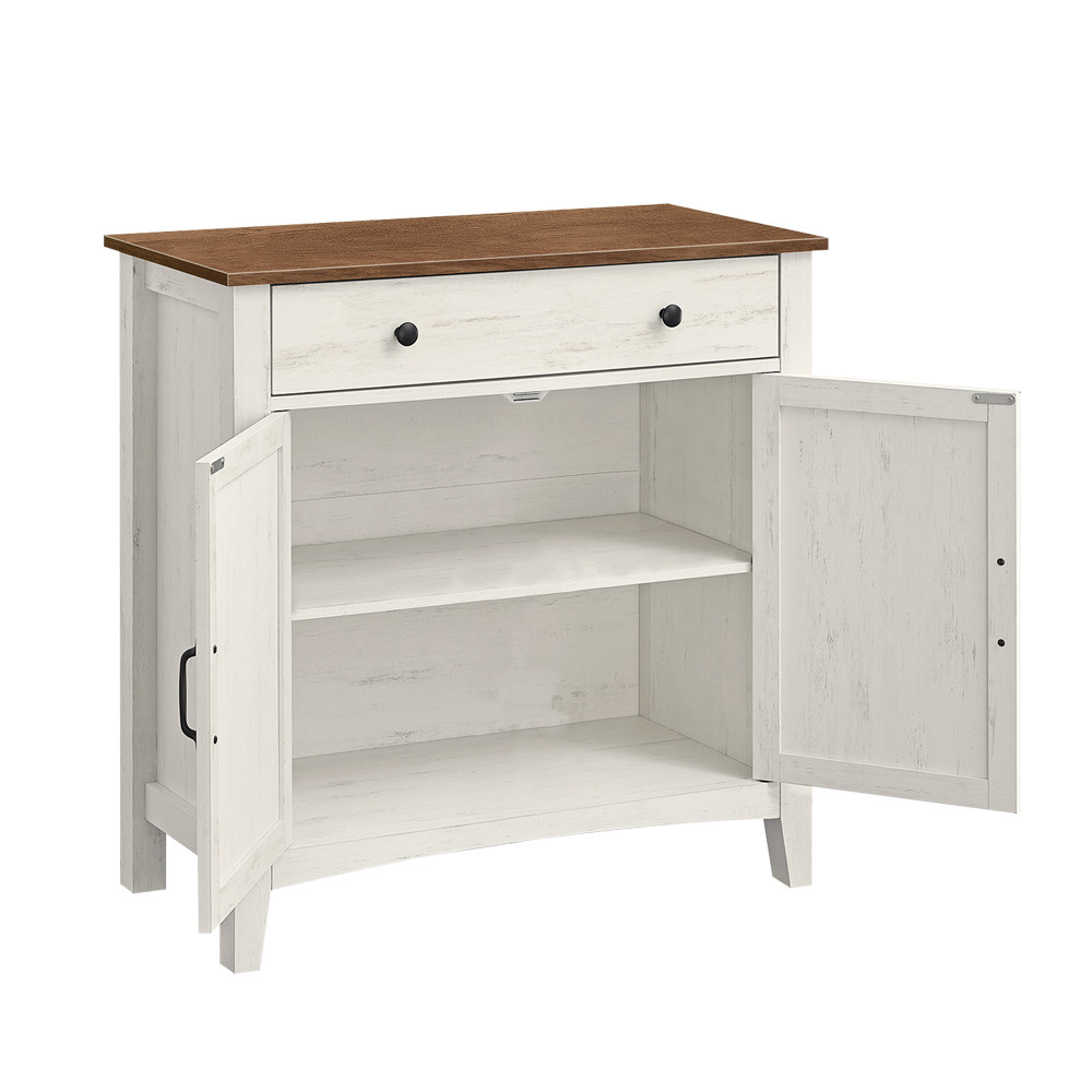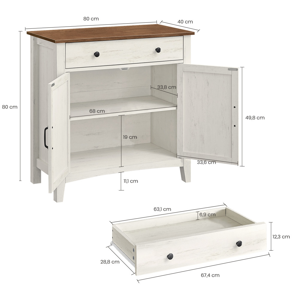 Tato rustikální úložná skříň v bílé a medově hnědé barvě je praktickým a stylovým doplňkem do obývacího pokoje, jídelny nebo předsíně. Komoda se zásuvkou, prostornou policovou skříní a nastavitelnou policí poskytuje ideální místo pro uložení menších i větších předmětů, zatímco farmářský styl vnese do vašeho domova teplo a charakter.