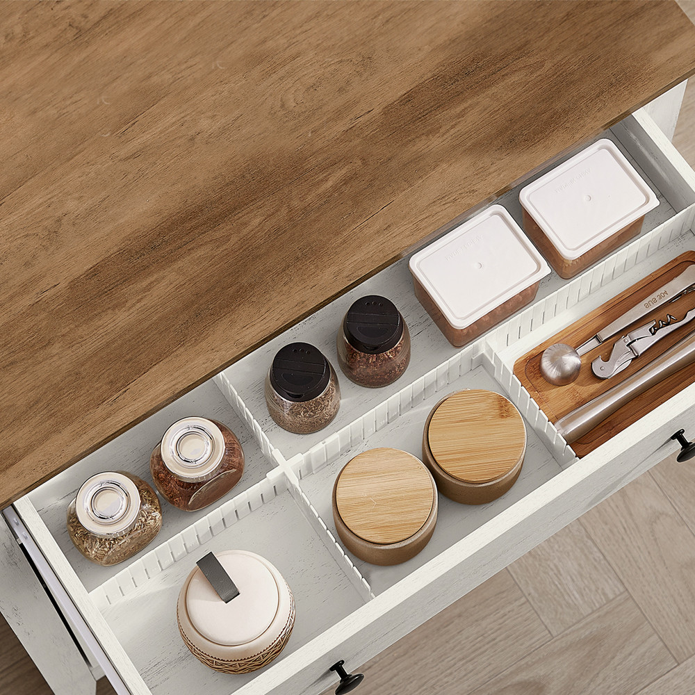 Dělicí vložka v zásuvce pomáhá udržet pořádek v drobnostech a police ve spodní skříni je nastavitelná v 5 různých výškách, takže se snadno přizpůsobí různým velikostem uložených věcí.