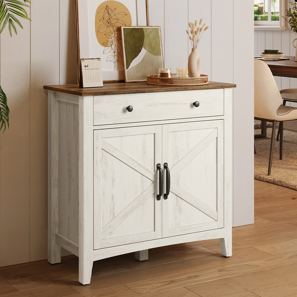 Posuvné dveře ve farmářském stylu a kombinace bílé a hnědé barvy dodávají skříni nadčasový venkovský vzhled. Je perfektní volbou jako TV stolek do obývacího pokoje, příborník do jídelny nebo kávový koutek do kuchyně – univerzální design se hodí do každé místnosti.