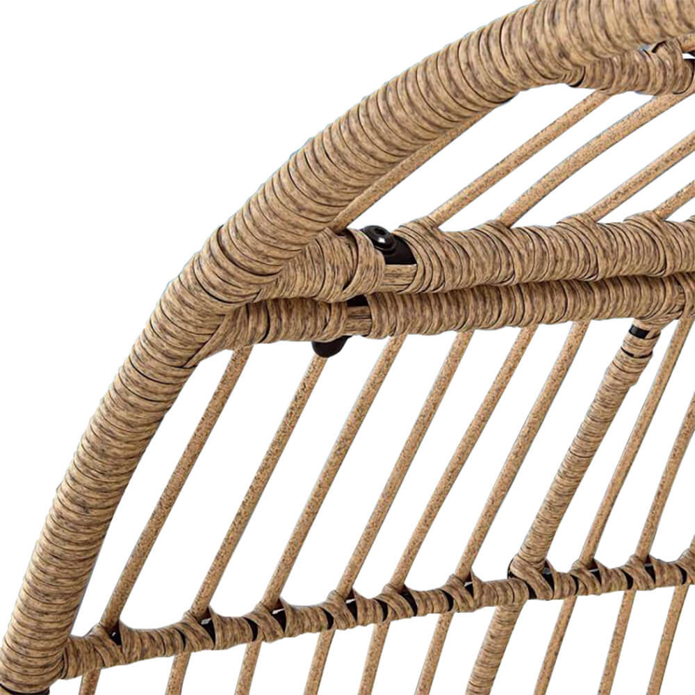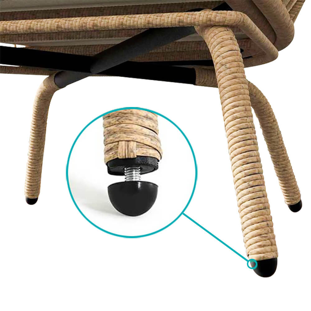 Rám křesla je vyroben z pevného kovu, který unese až 120 kg. Protiskluzová úprava na nohách chrání podlahu a zajišťuje stabilitu. Povrchová úprava z PE ratanu je odolná vůči povětrnostním vlivům, takže je křeslo vhodné jak pro vnitřní, tak venkovní použití.