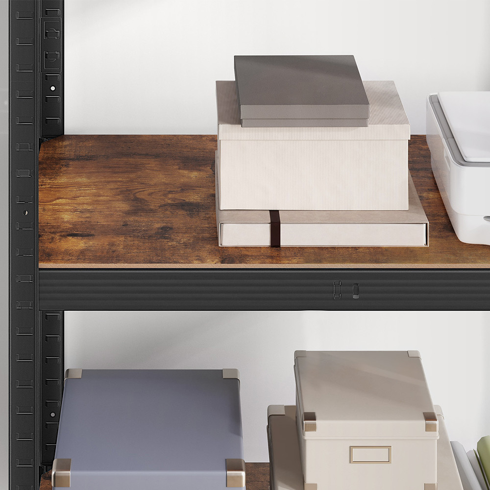 Hnědé, rustikálně laděné police a černý ocelový rám dodávají stylový industriální vzhled. Perfektně se hodí do obývacího pokoje, pracovny nebo dílny.