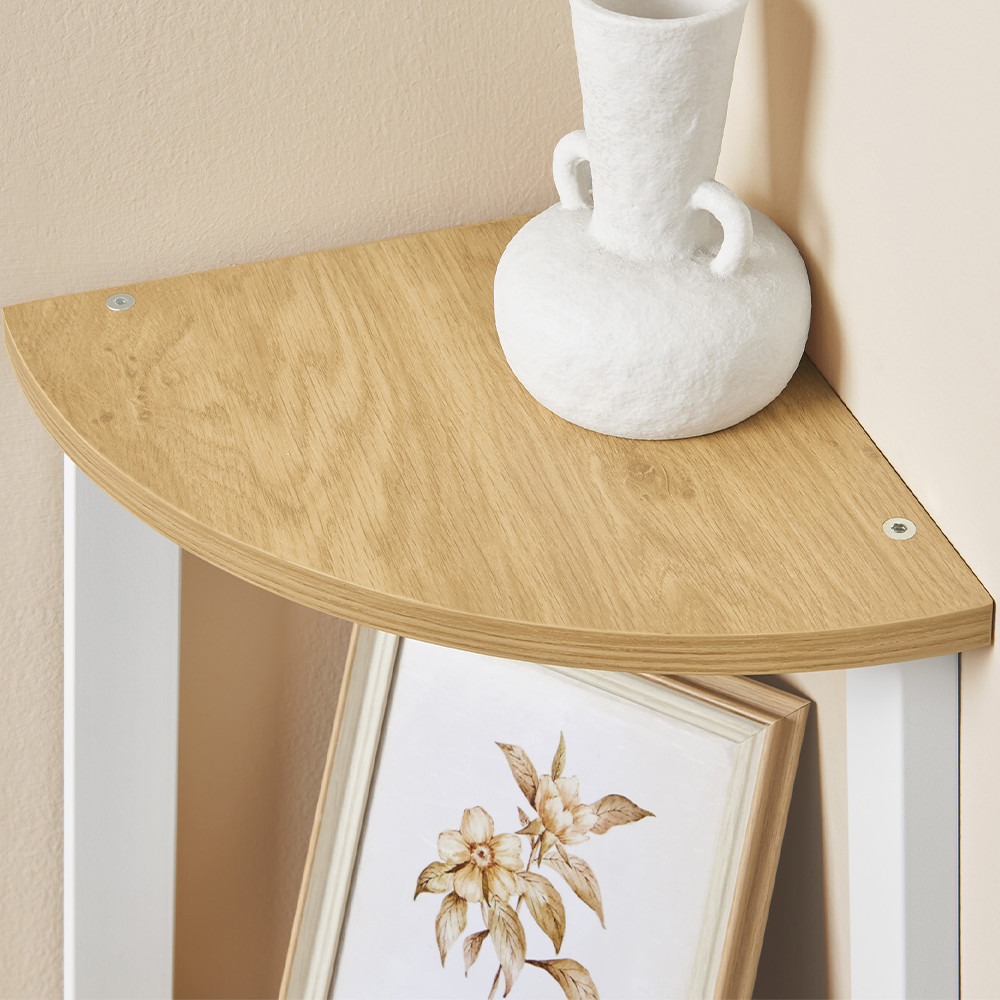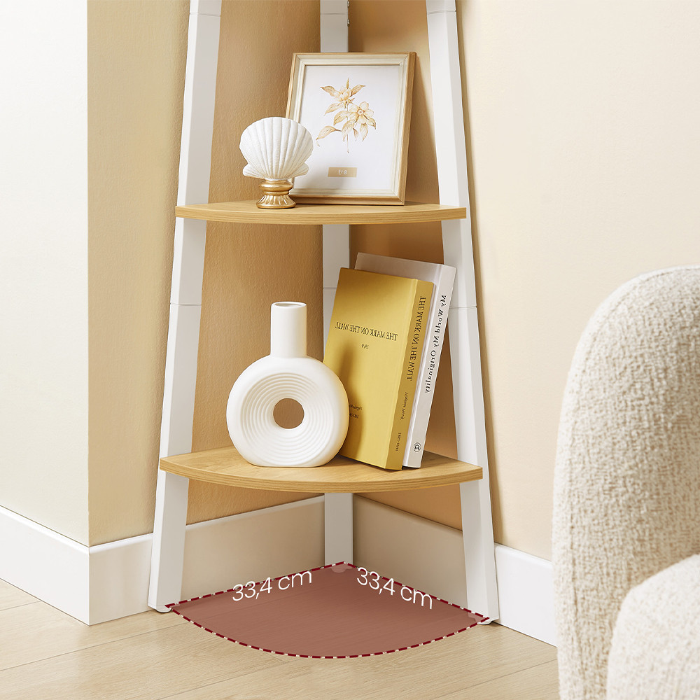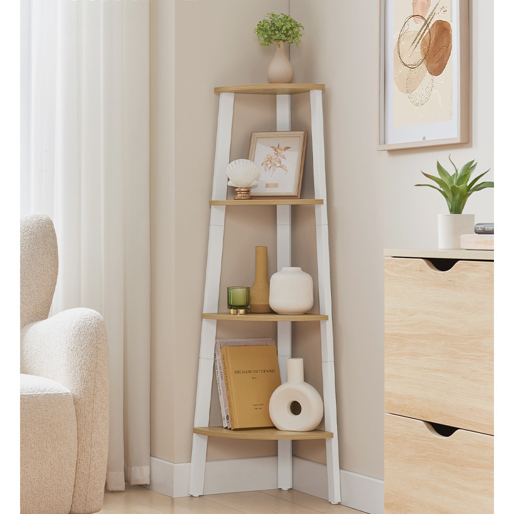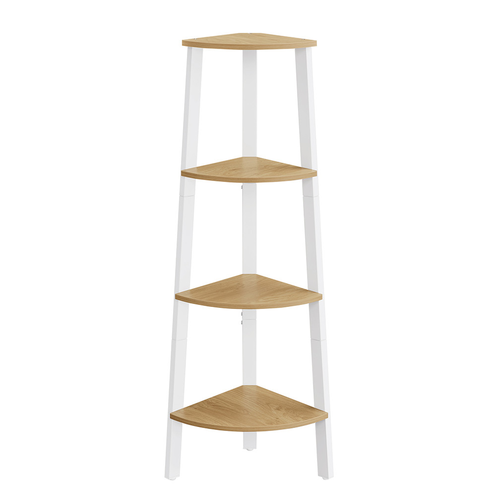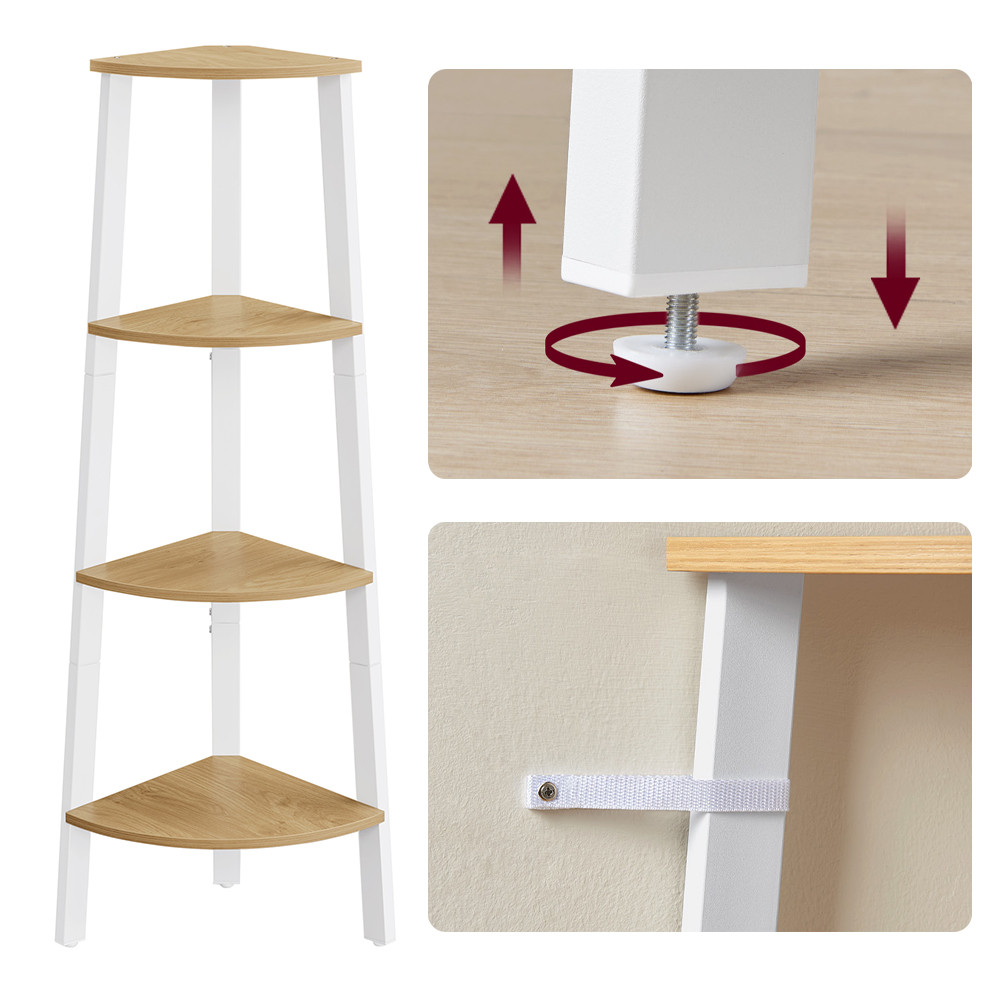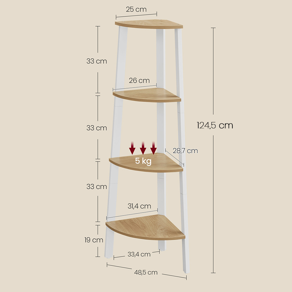 Toto praktické policové řešení umožňuje využít úložný potenciál rohů místností. Ať už chcete vystavit knihy, rostliny, dekorace nebo každodenní předměty, 4patrové provedení pomůže udržet vše přehledně a úhledně uspořádané.