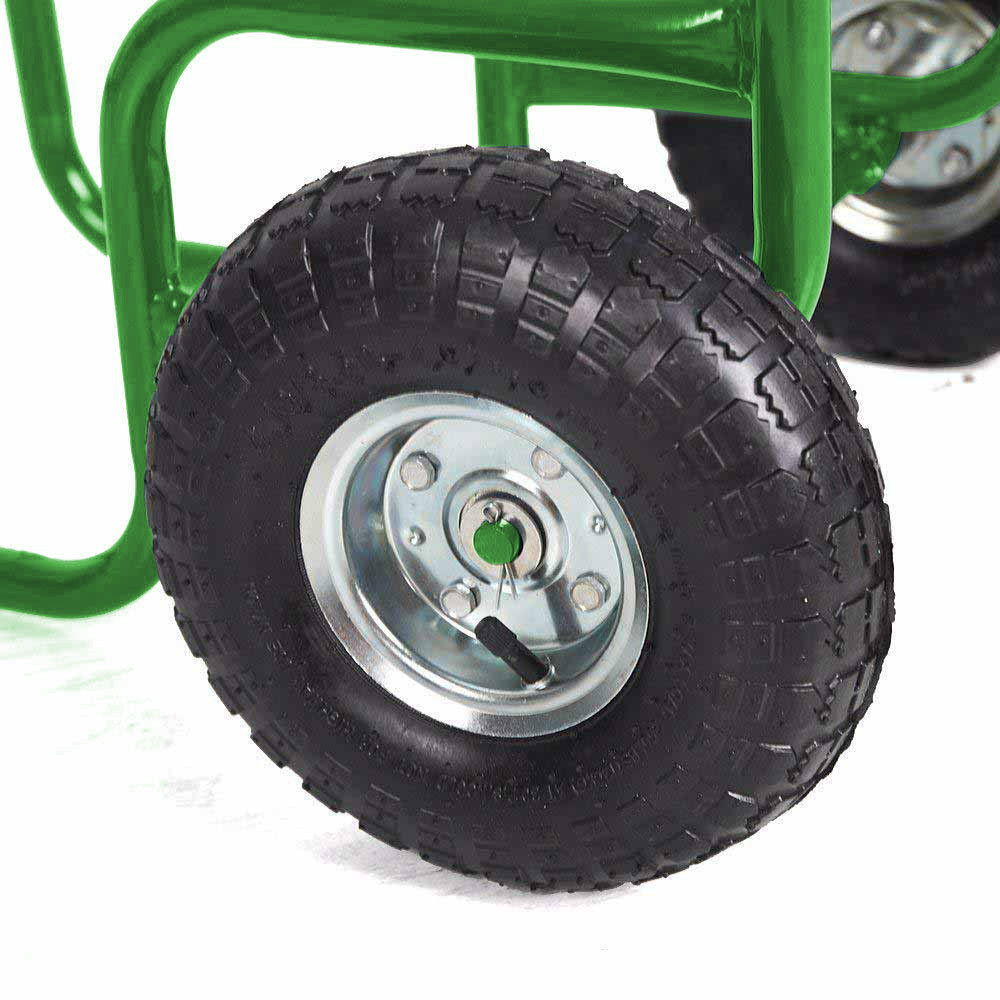 Kovová konstrukce vozíku zaručuje jeho odolnost, zatímco nafukovací kola umožňují snadnou manipulaci i na nerovném terénu. Kola jsou vybavena kuličkovými ložisky a pevným ocelovým nápravem pro hladkou manipulaci a dlouhou životnost.