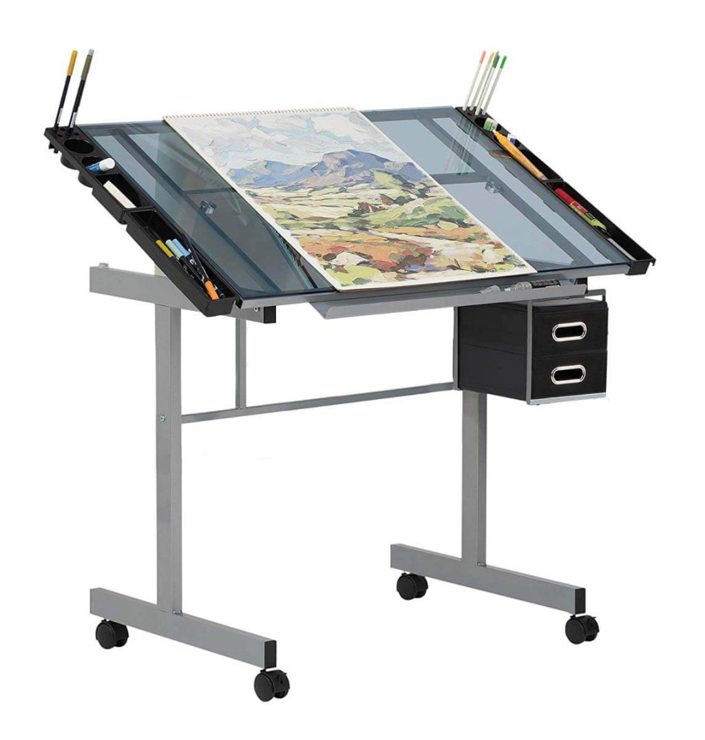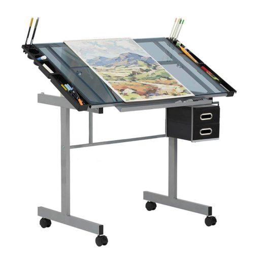 Desku lze naklopit v rozsahu 0–63°, takže si snadno nastavíte nejpohodlnější úhel pro práci. Skleněná deska umožňuje podsvícení (světlo není součástí balení), což je ideální pro technické výkresy, grafické návrhy a další precizní práce.