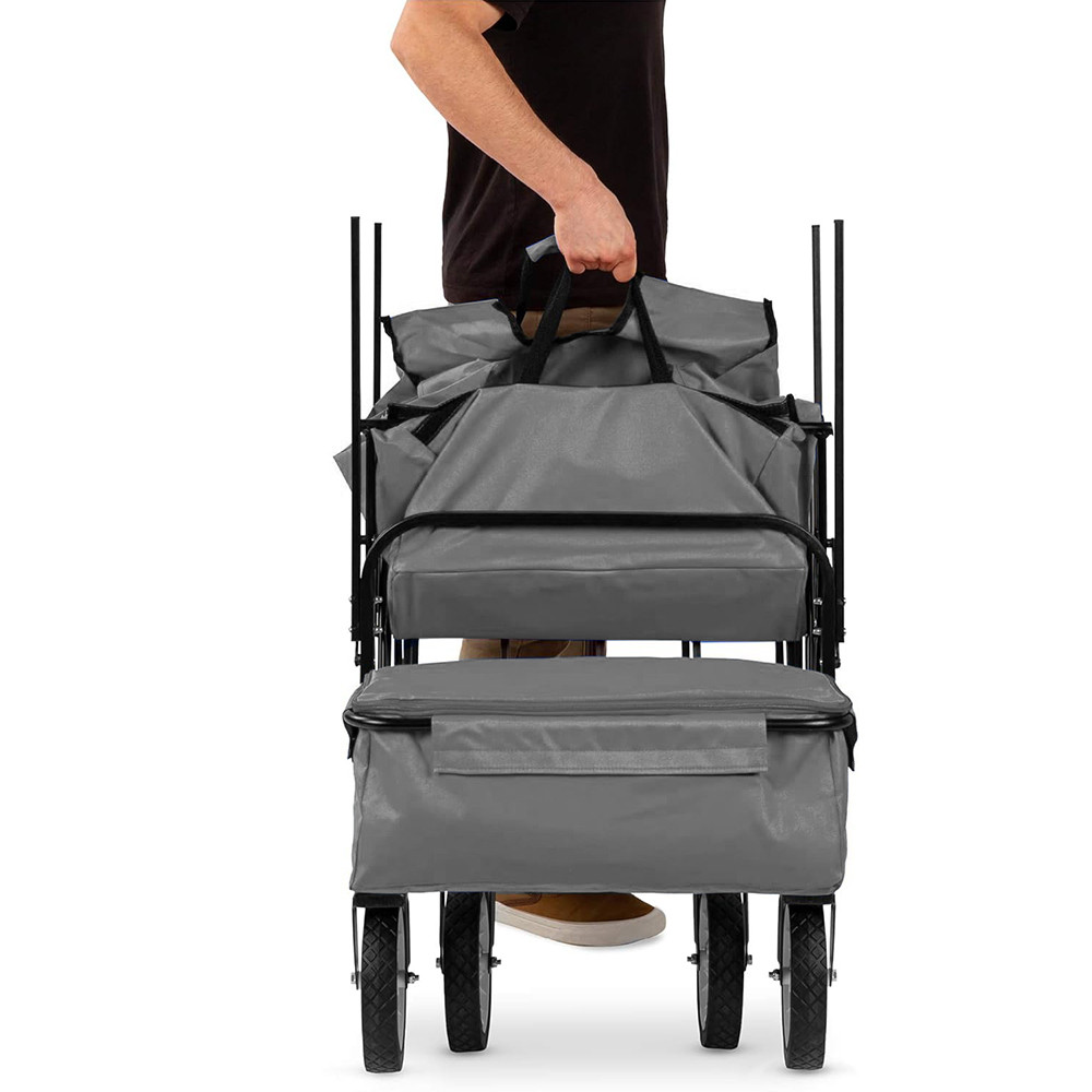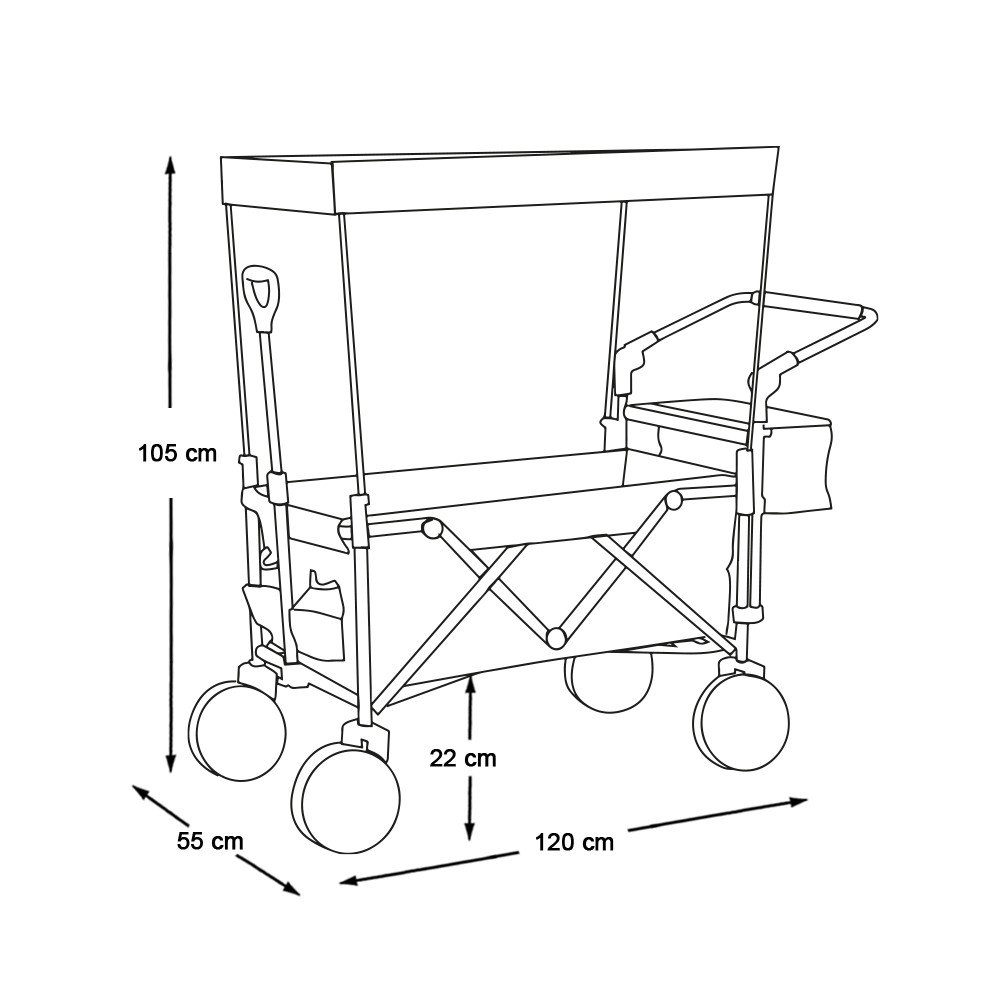 Tažný vozík má vyjímatelnou vnitřní vložku a střechu, které jsou snadno čistitelné, a rám je jednoduše skládací, takže si ho můžete vzít kamkoliv s sebou. Skladování nevyžaduje mnoho místa, může být umístěn v garáži nebo dokonce ve skříni. Po stranách jsou 2 menší kapsy a samostatný odnímatelný úložný prostor na další věci a potraviny.