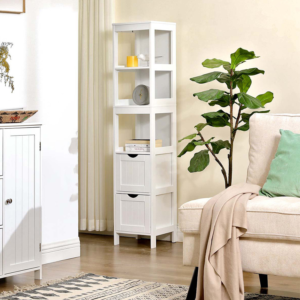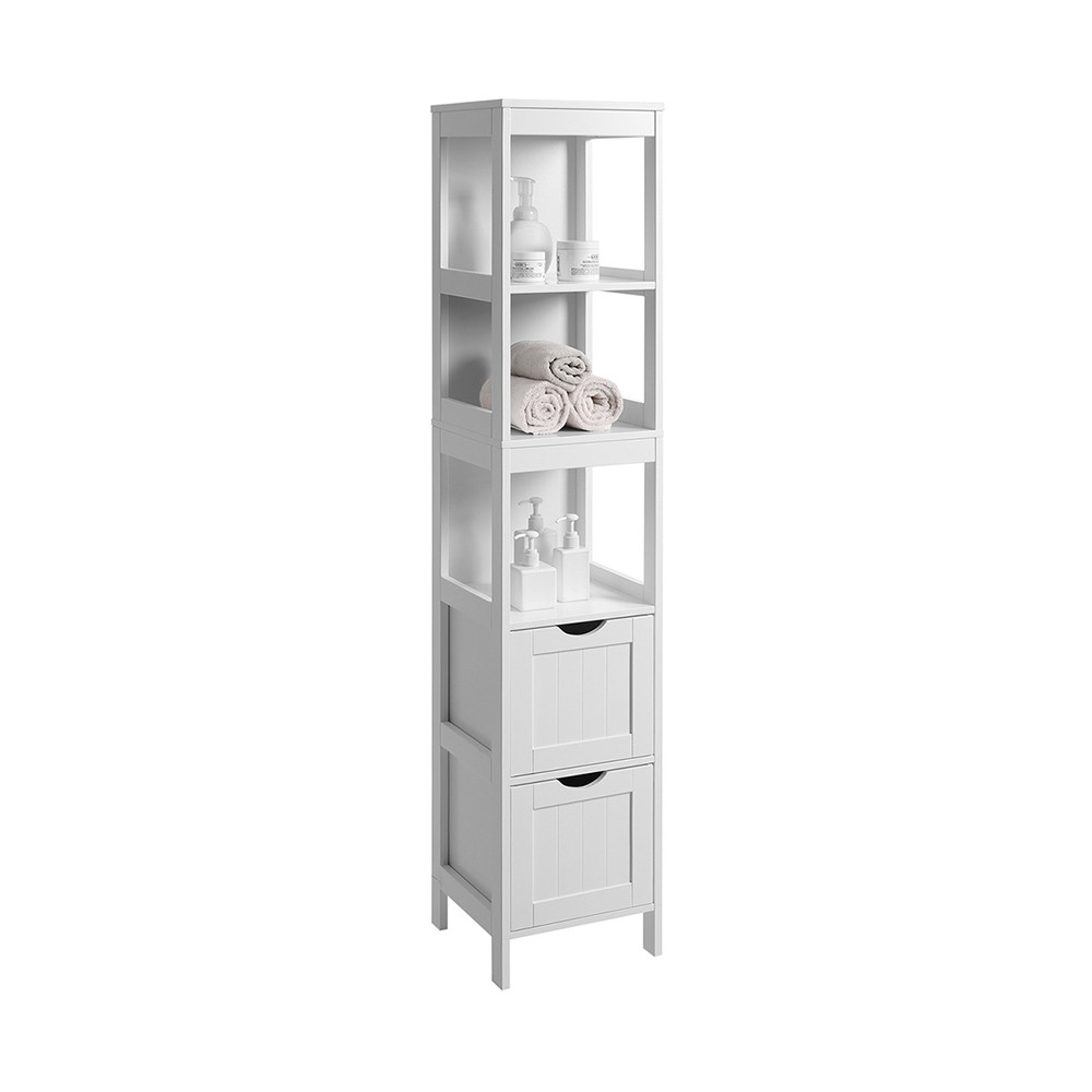Tato úzká, vysoká koupelnová skříň je ideální volbou do menších prostor, kde je důležité praktické a vkusné uspořádání. Stojací skříň nabízí tři otevřené police a dvě přesouvatelné zásuvky, které umožňují flexibilní uspořádání, přičemž její stabilní konstrukce a elegantní bílá barva se harmonicky hodí do každého domova. Koupelnová skříň se snadno montuje, takže ji můžete rychle začít používat. Perfektní řešení, pokud potřebujete estetický a praktický koupelnový úložný prostor.