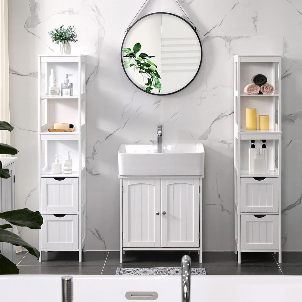 Dvě odnímatelné zásuvky lze libovolně přesouvat do spodních otevřených přihrádek, takže se skříň přizpůsobí různým potřebám ukládání. Ať už chcete ukrýt kosmetiku nebo menší ručníky, toto řešení se vždy přizpůsobí vám.