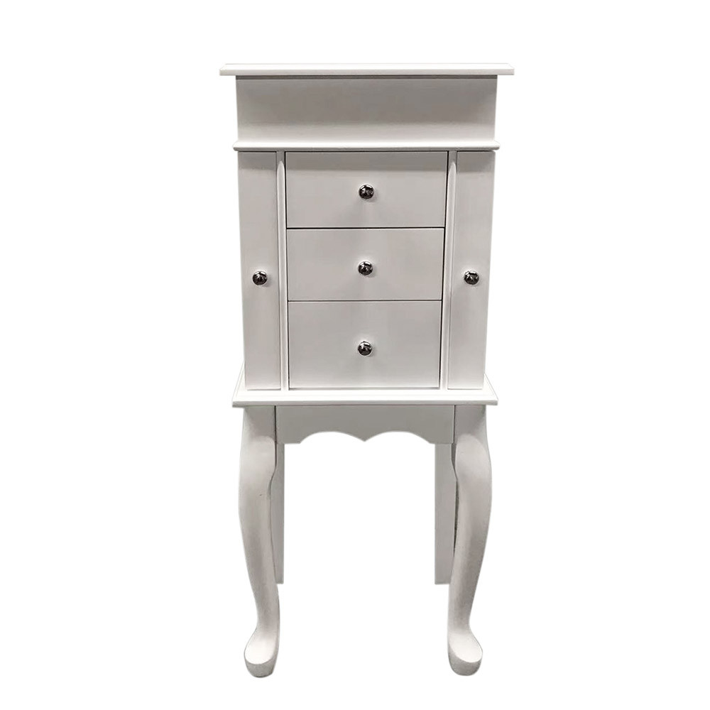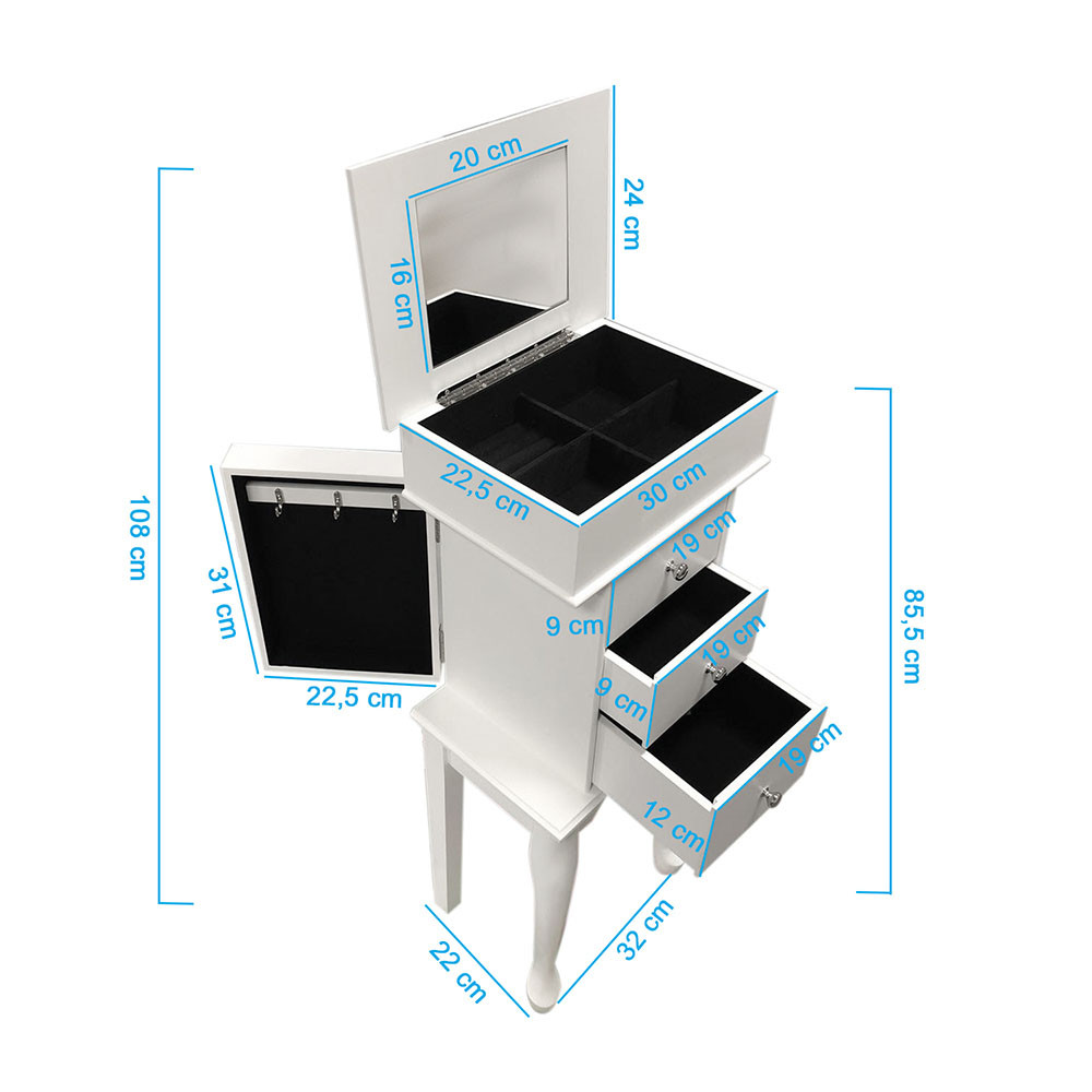 Pevná dřevěná konstrukce zajišťuje dlouhou životnost, zatímco černý sametový interiér chrání šperky před poškrábáním. Klasická bílá barva je nadčasová a snadno zapadne do každého interiéru.