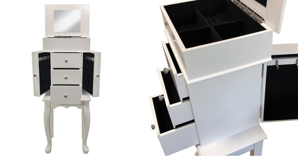 Praktické vnitřní uspořádání umožňuje systematické ukládání šperků. Tři zásuvky, dvě boční skříňky a horní úložný prostor se zabudovaným zrcadlem poskytují dostatek místa pro náhrdelníky, prsteny, náramky a další doplňky.