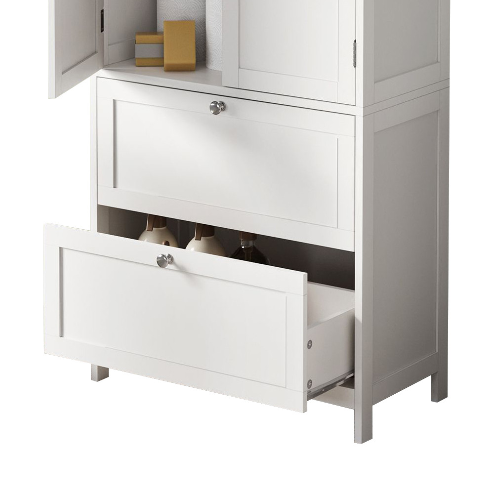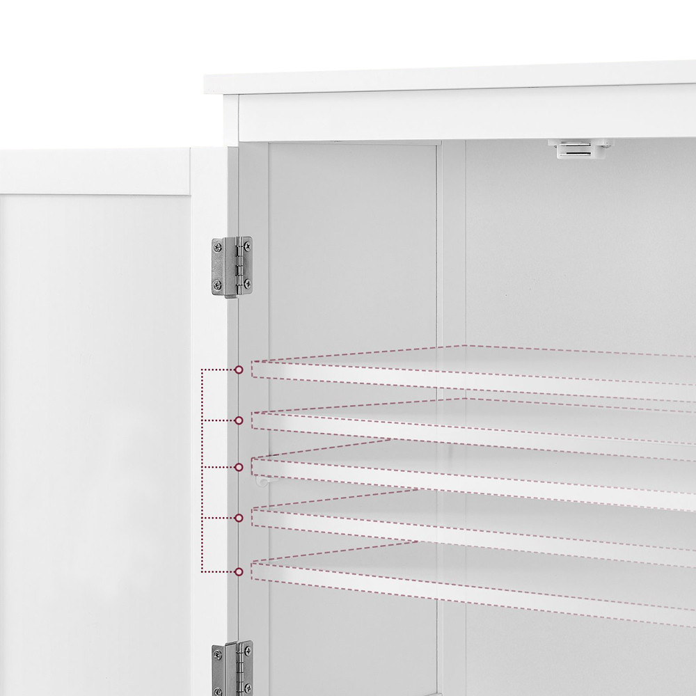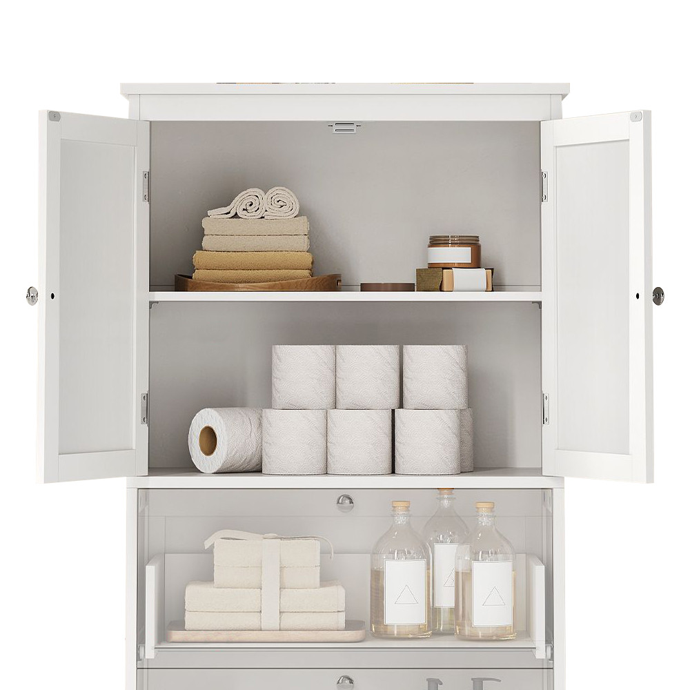 Bílá barva, ozdobné panely dveří a čisté linie dodávají prostoru eleganci a snadno zapadnou do každého koupelnového interiéru.