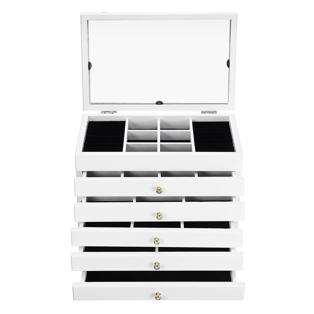 Tento 6 přihrádkový šperkovník je ideální volbou pro všechny, kteří chtějí mít své oblíbené šperky přehledně uspořádané. Pět výsuvných šuplíků a jednotlivé přihrádky zajistí, že každý doplněk bude mít své vlastní místo. Speciální válečky na prsteny zabraňují poškrábání, takže i dražší šperky budou v bezpečí.