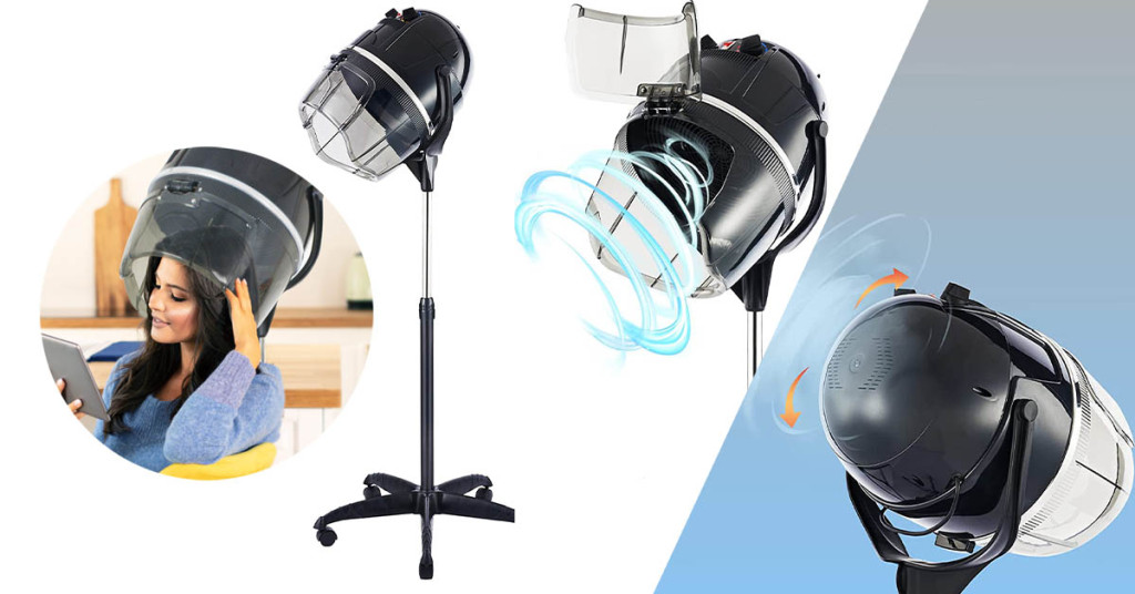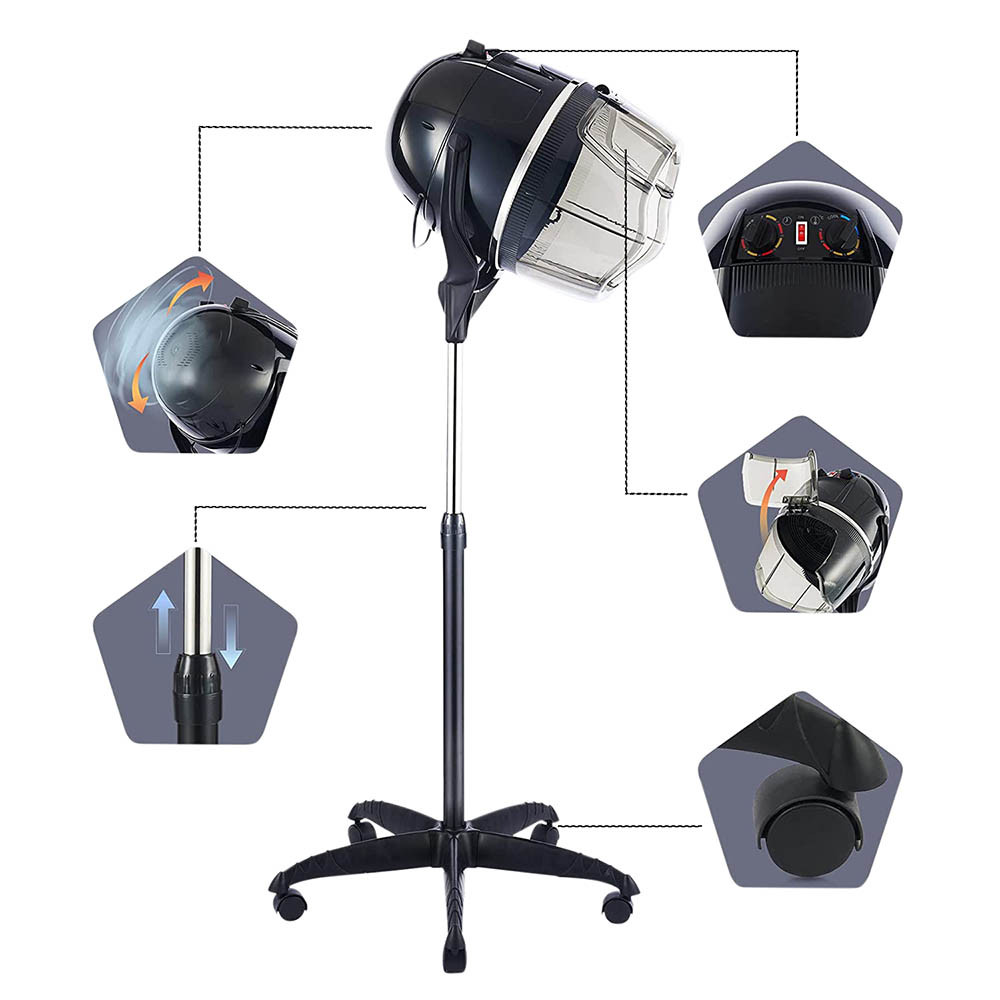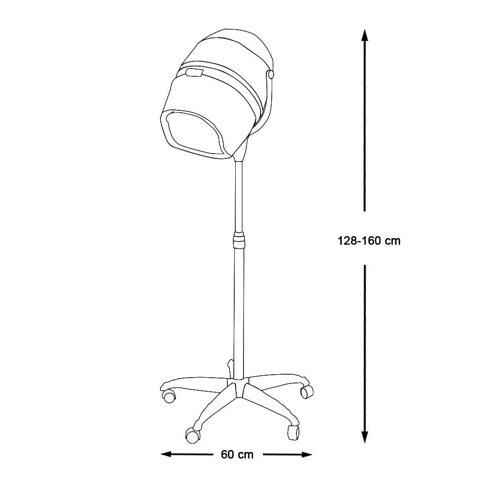 Výšku stojanové sušící helmy lze nastavit v rozmezí 128 až 160 cm, což umožňuje pohodlné používání pro každého. Díky otočným kolečkům s 360° rotací je snadno přemístitelná a praktická v jakémkoliv pracovním prostoru.