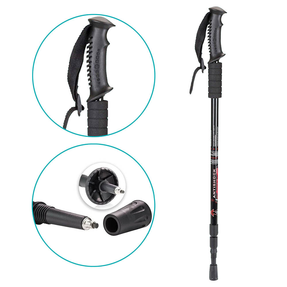 Teleskopická hůl se složí na 64 cm, v rozloženém stavu má délku 132 cm. Rukojeť kombinuje gumu a EVA, hrot je z uhlíkové oceli a tělo z hliníku, nosnost až 80 kg. Nízká hmotnost a praktická velikost ji činí ideální pro každého turistu. Nastavitelná funkce ochrany proti nárazům (antishock)