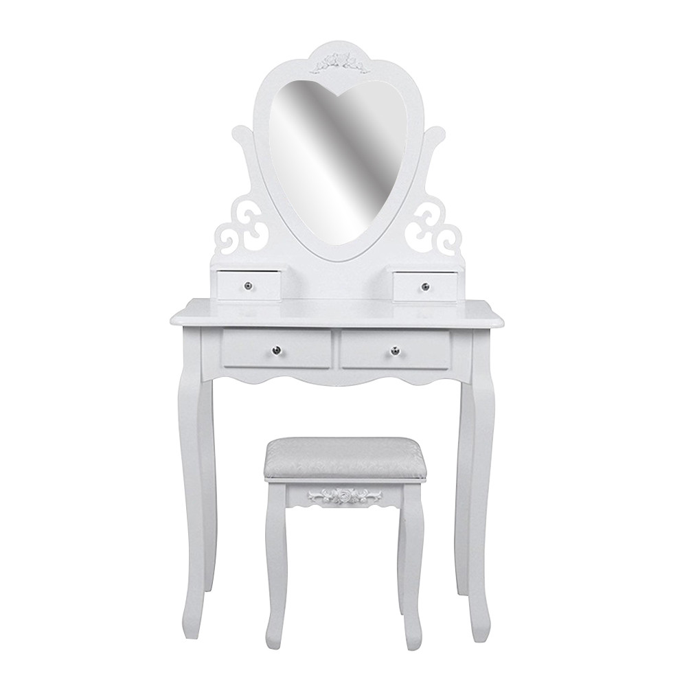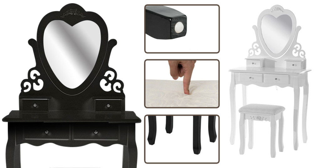 Tento dřevěný toaletní stolek se zrcadlem je opravdovým klasickým kouskem, který se skvěle hodí do ložnice, šatny nebo elegantního salonu. Polstrovaná židle je pohodlná a dekorativní, takže každá chvíle u stolku bude příjemným zážitkem. Díky zabudovaným úložným prostorům si snadno uspořádáte všechny doplňky, kosmetiku či šperky. Odnímatelná horní část umožňuje použít stolek také jako psací stůl.