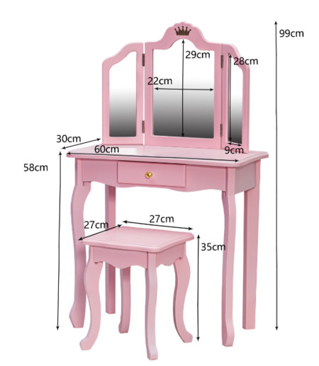 Toaletní stolek s klasickými tvary krásně zapadne do každého dětského pokoje. Je vyrobený z malovaného dřeva, takže je nejen krásný, ale i pevný. Prostorná zásuvka nabízí místo na všechny drobnosti a doplňky potřebné ke hře.