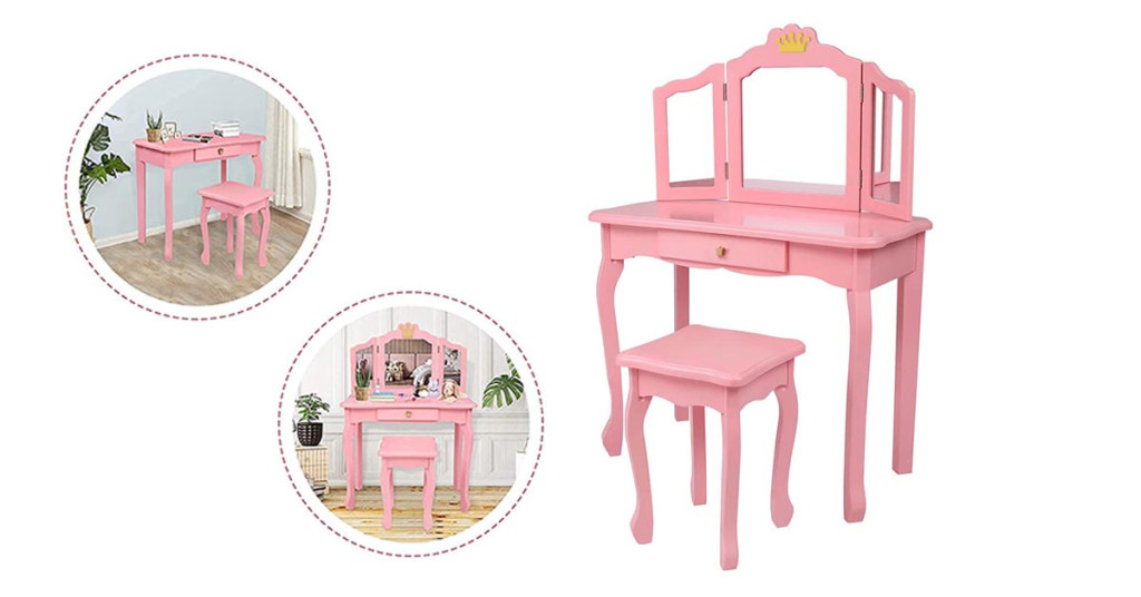 Růžový dětský toaletní stolek je ideální volbou, pokud chcete do pokojíčku vaší holčičky přidat kouzelný kousek nábytku. Sklopná zrcadla a zlatá korunka připomínají pohádkový svět a podporují rolové hry, které rozvíjejí dětskou představivost.
