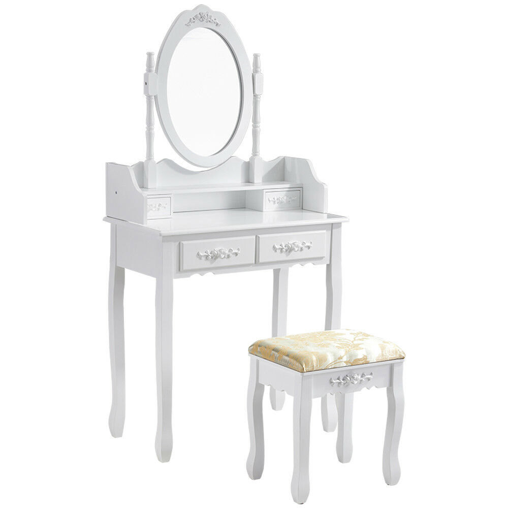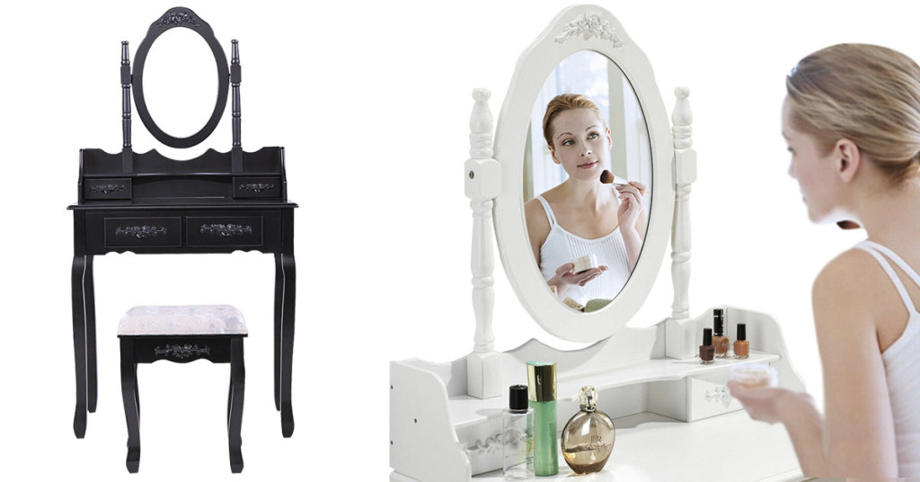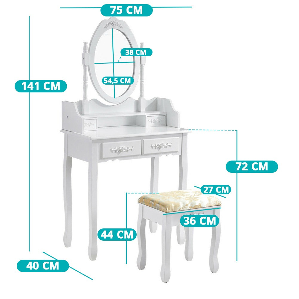Toaletní stolek disponuje čtyřmi zásuvkami: dvě menší jsou umístěny na horní poličce, zatímco dvě větší pod hlavní deskou. Veškeré potřebné doplňky tak budou snadno dostupné. Díky odnímatelné horní části lze stolek využít i jako psací stůl, což umožňuje jeho univerzální začlenění do jakéhokoli interiéru.