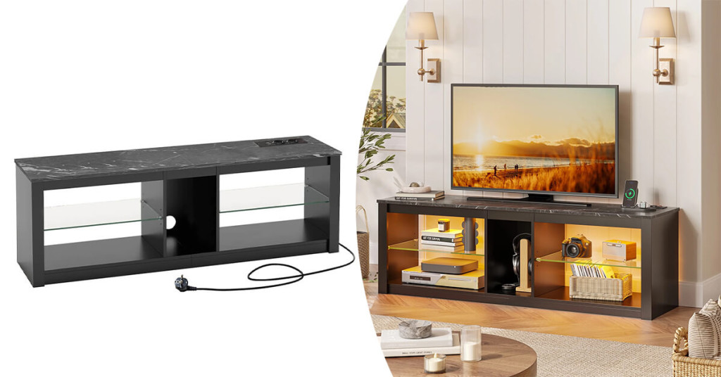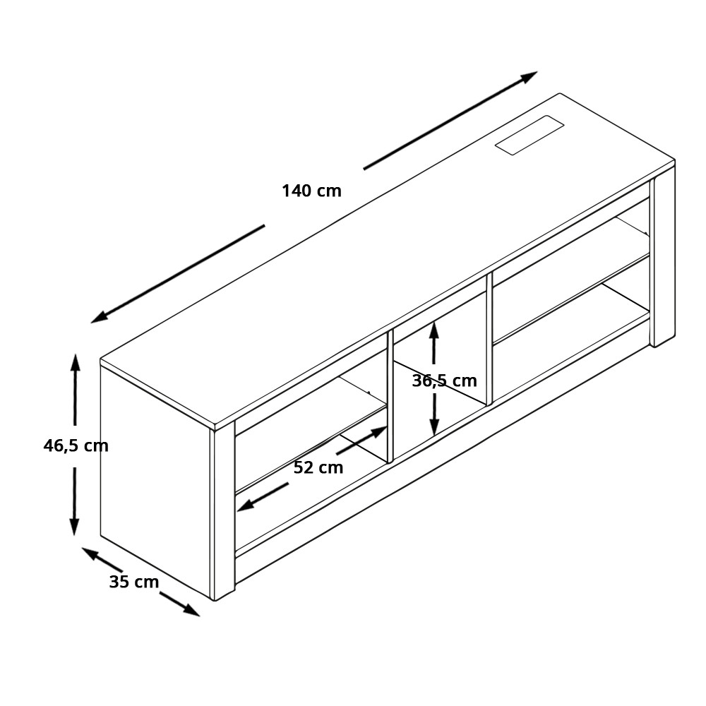 Policová konstrukce stolku nabízí dostatek prostoru pro multimediální zařízení, dálkové ovladače, herní konzole a další příslušenství. Střední a spodní úložné prostory umožňují organizované skladování, zatímco vestavěné zásuvky a USB 2.0 porty usnadňují nabíjení a připojení zařízení.