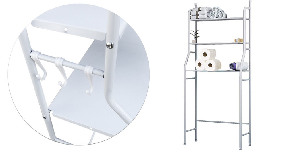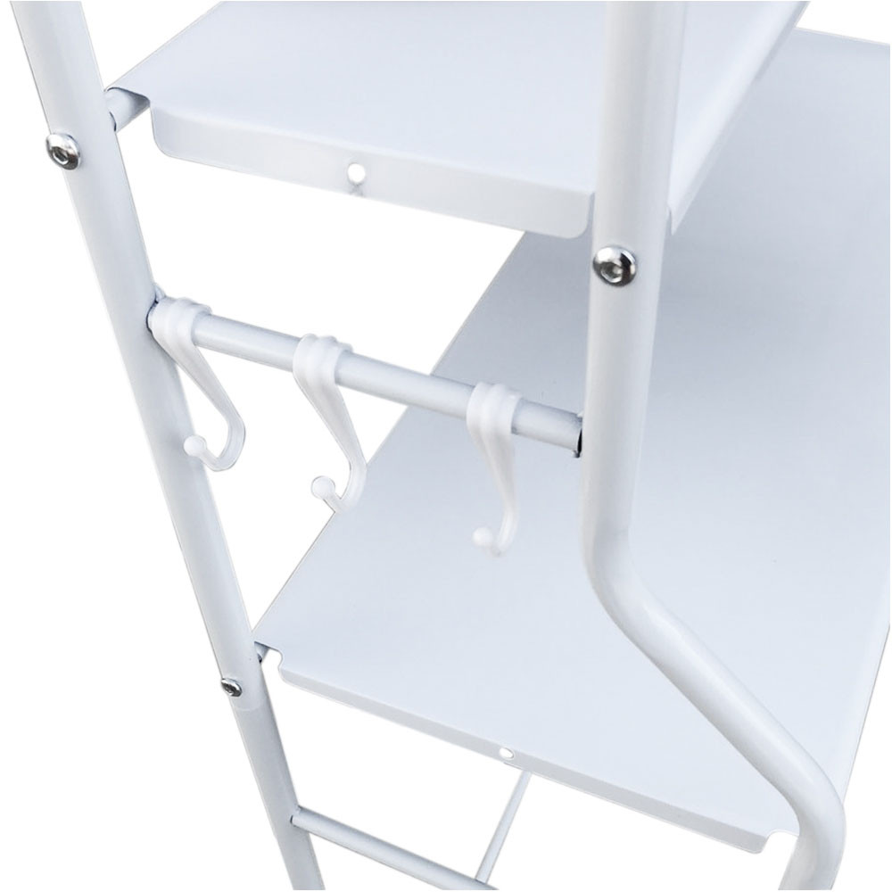 Úložný regál je vybaven třemi háčky, které si můžete umístit podle svých potřeb. Tyto háčky jsou ideální pro zavěšení menších předmětů, například koupelnových pomůcek nebo ručníků, abyste je měli vždy po ruce.