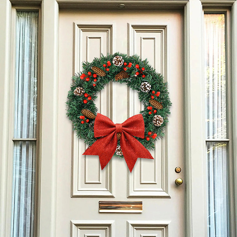 Základ venca tvoria husté, realistické umelé jedľové vetvičky, ktoré pôsobia prírodným dojmom a zároveň sú trvácne a ľahko udržiavateľné. Červená saténová mašľa slúži ako výrazný prvok, ktorý dodáva vencu sviatočný šarm a teplú atmosféru.