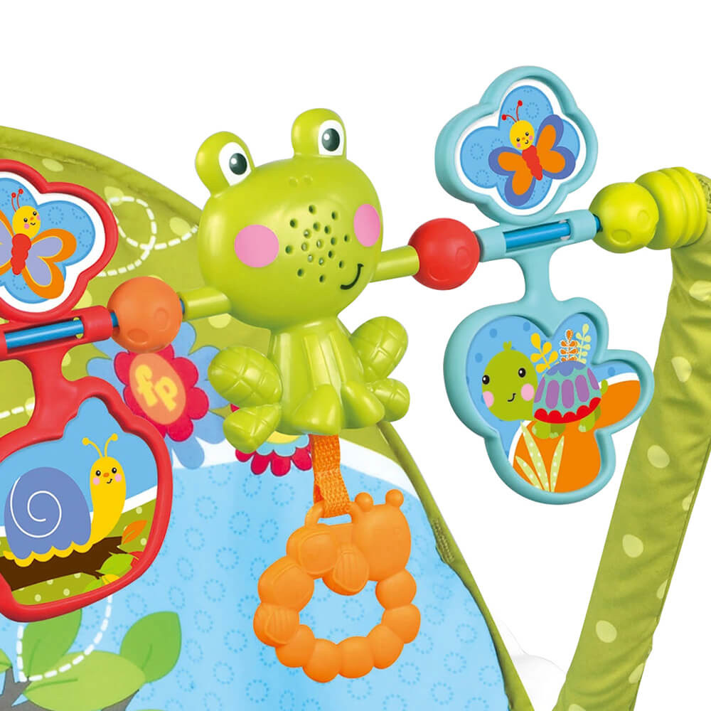 Součástí lehátka je roztomilá hrazdička s hračkami, které stimulují smyslový vývoj a motorické dovednosti dítěte. Hrazdička je snadno dosažitelná a barevné, přátelské figurky zajišťují zábavný herní zážitek pro nejmenší.