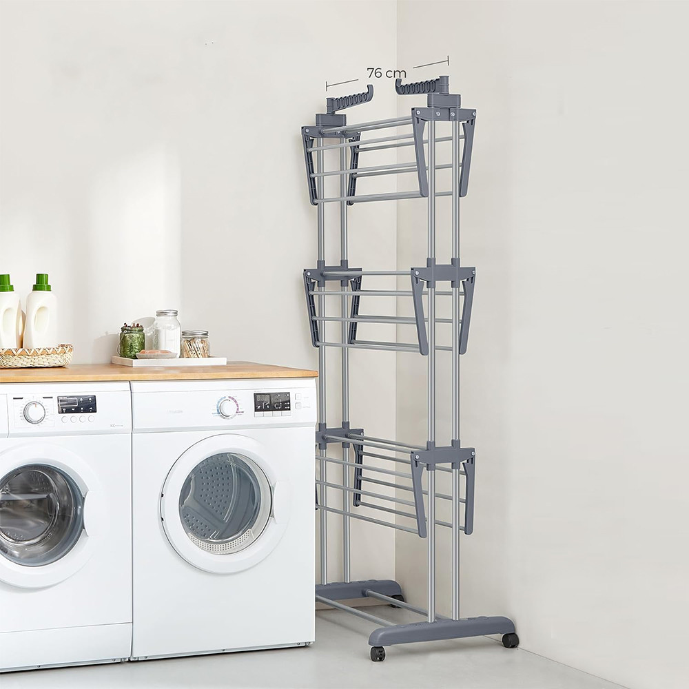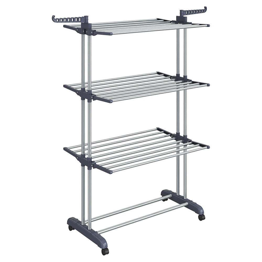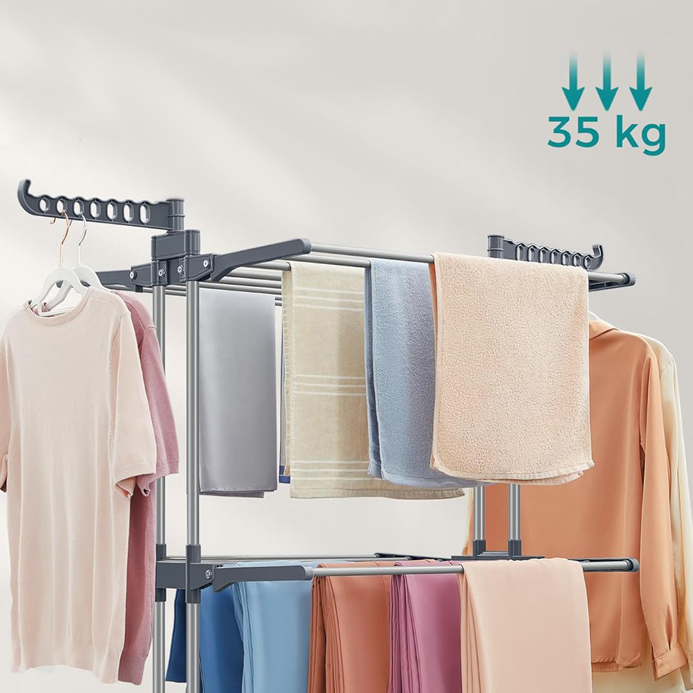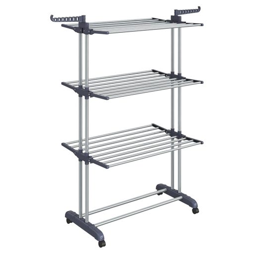 Boční háčky jsou ideální pro oblečení na ramínku, spodní část je vhodná i pro sušení bot. Police lze podle potřeby sklopit, čímž ušetříte místo, když sušák nepoužíváte.